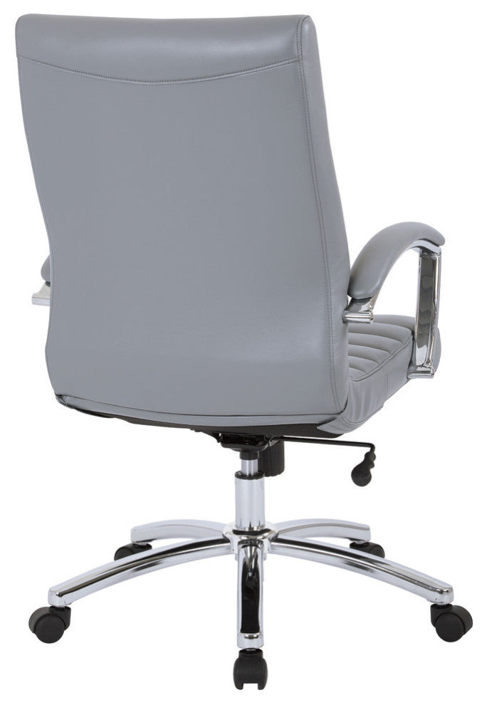 The Back Leather Executive Office Chair helps you complete your tasks in comfort and style. Its plush gray seat features elegant horizontal tufts and an ergonomic curved design. Set on casters, this chair is easy to move around to suit your needs during the day. Its height is also adjustable to help maximize your comfort.