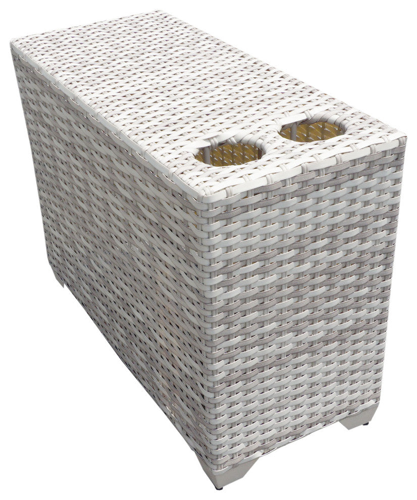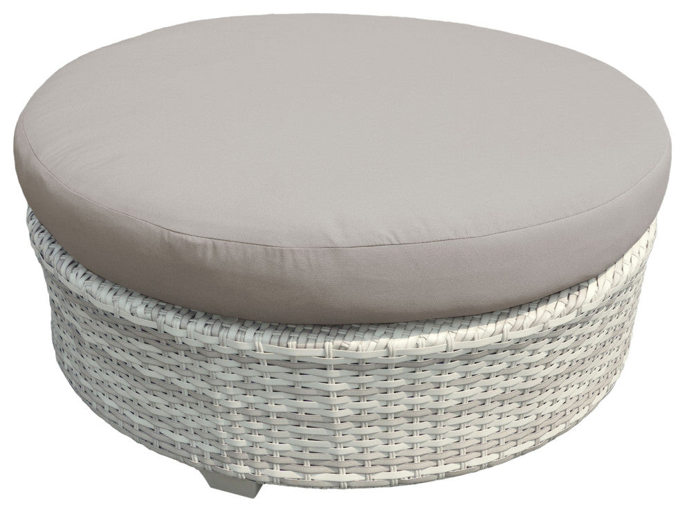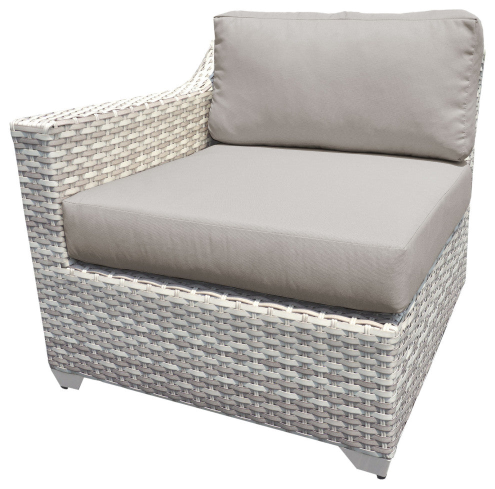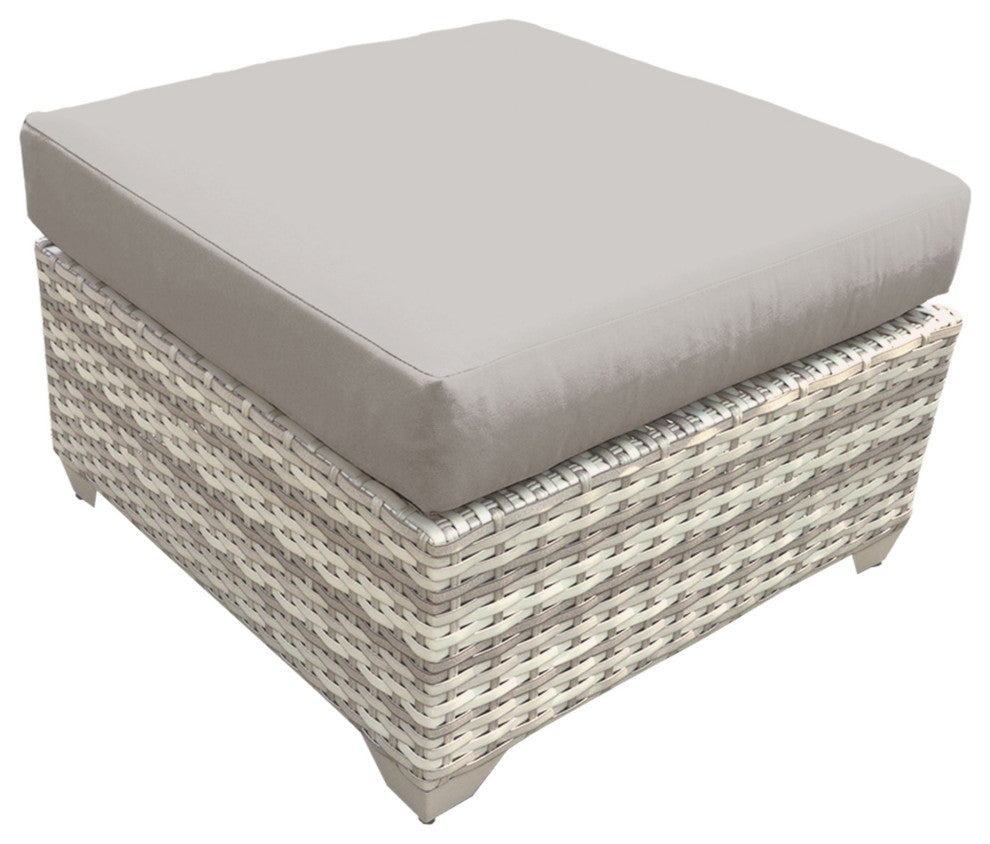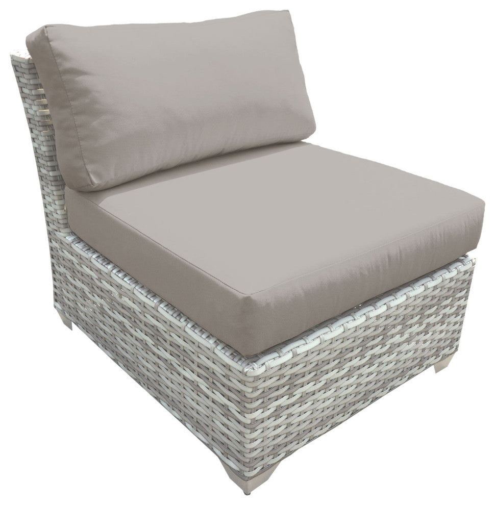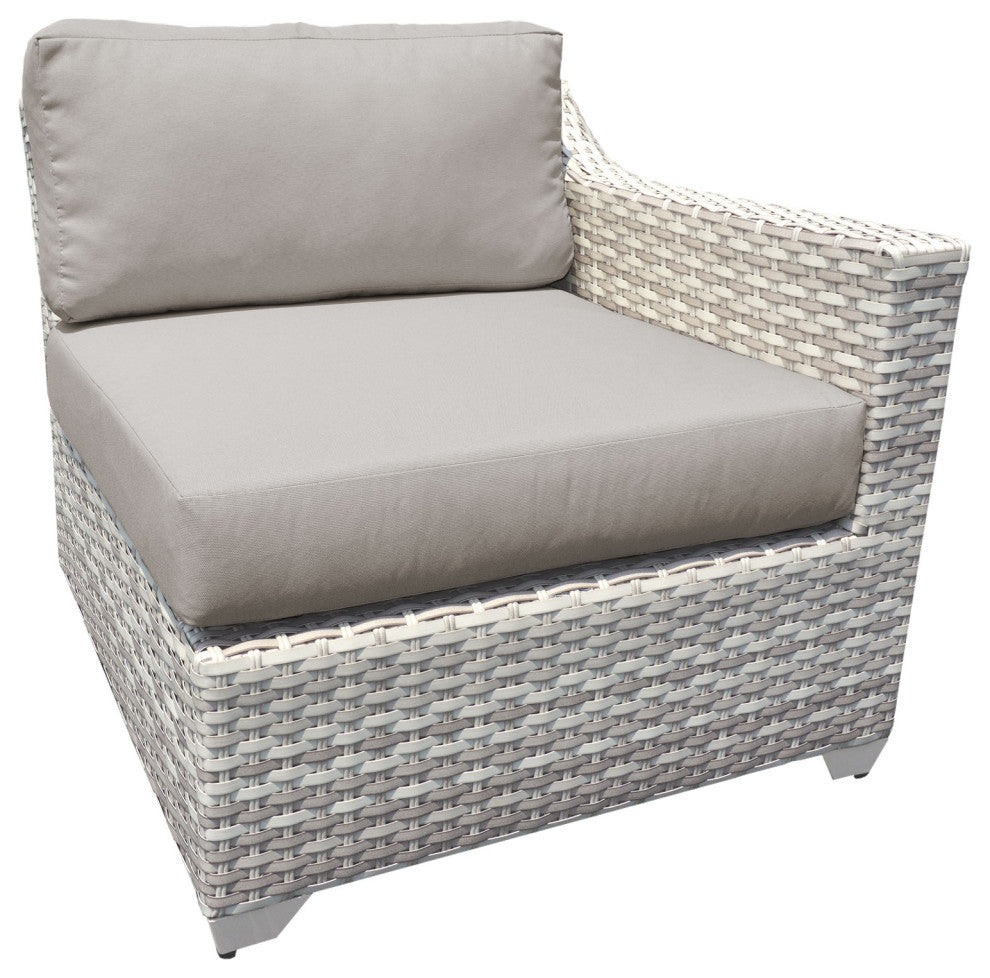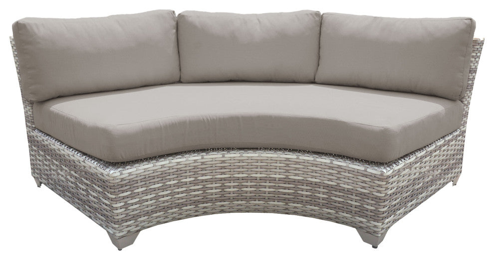 Imagine the soft, sumptuous, 6" cushions enveloping you on a warm summer night. Striking, varying and light hues create the Vanilla Créme color of this dramatically styled wicker collection. Experience the subtle changes of color as the sunlight dances across the luxurious, woven wicker throughout the day. Our sophisticated modular design opens up endless configuration possibilities to suit your every whim. A new standard of patio opulence has been set. Welcome, to the Fairmont.Features:CUSHIONS - 6 inches thick for a luxurious look and feelCUSHION COVERS - Washable and zippered for easy cleaning (air dry only)FEET LEVELERS - Height adjusters for uneven surfaces that won"™t mar your patio or deckTABLE TOPS - Cast aluminum with a durable powder coated finishFULLY ASSEMBLED - Ready to use and enjoySTORAGE - Rectangle coffee table doubles as storage• Custom hand woven all-weather, high density, PE (polyethylene) wicker• Strong rust resistant, powder coated aluminum frame for maximum durability• Commercial grade construction• No Sag solid wicker bottoms with extra flexible strapping providing long-lasting suspension• Perfect for outdoor use in all climates• Elegant design includes angled backs• Includes seat and plush back cushions for maximum comfort• New rust-resistant, powder coated feet which are color matched with table topsAll sets will come with Vanilla Créme wicker and Beige covers on the cushions.OPTIONAL:• Decorative throw pillows in matching or contrasting colors or print.• Second set of cushion covers in the color of your choice.• Clips not included but may be purchased separately.If you don"™t see a configuration that fits your needs, please contact us and we"™ll help you build your own set!(4) Armless Sofa - 28"W x 35"D x 29"H(2) Ottoman - 28"W x 28"D x 19"H(1) Cup Table - 15"W x 35"D x 25"H(1) Round Coffee Table - 43"W x 43"D x 13"H (with cushion 19"H)(1) Curved Armless Sofa - 61"W x 35"D x 29"H(1) Left Arm Sofa - 35"W x 35"D x 29"H(1) Right Arm Sofa - 35"W x 35"D x 29"H