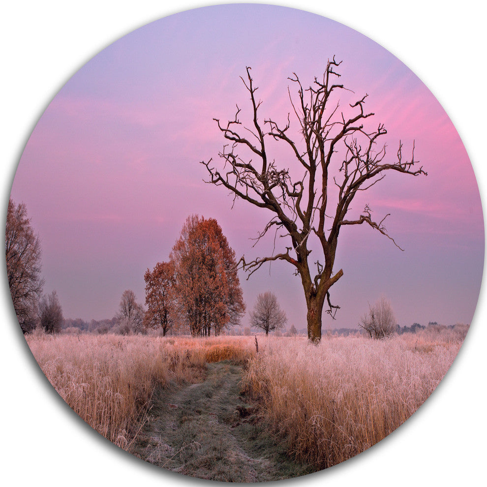 Bring Contemporary Abstraction to your home with this large Circle Metal wall art. This Fairy Autumn Sunrise with Lonely Tree Metal Artwork makes it the focal point of any room or office.