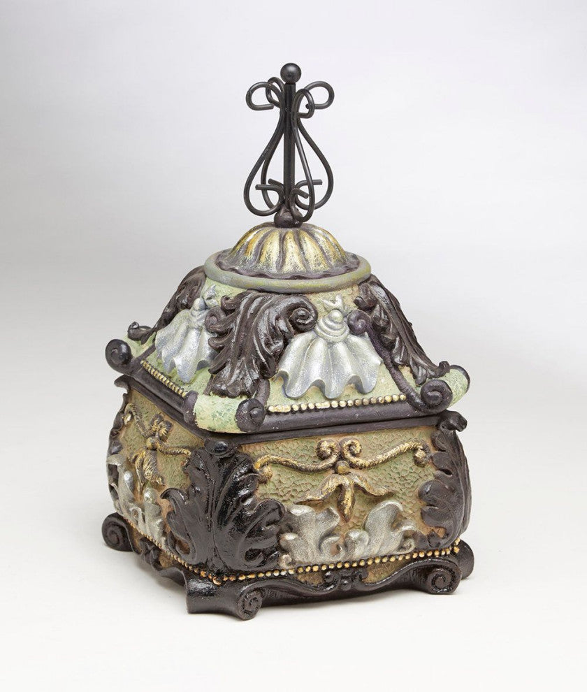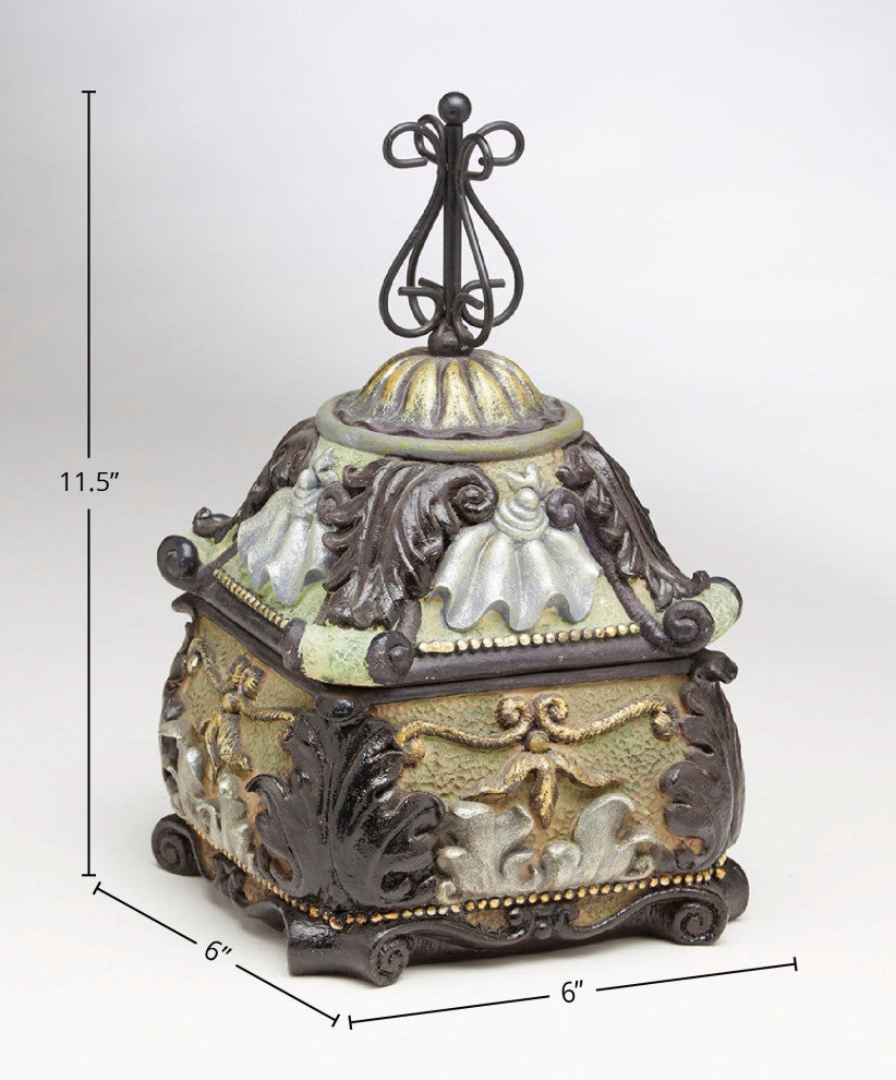 Store your jewelry or other trinkets with the Falkville Square Decorative Box. The box brings an antique look with its square shape and matching lid. The container can keep various items such as keys, coins, etc. Pretty much a decorative piece, this is perfect to place atop your console tables or nightstands.Features:Overall product dimensions are 6" W x 6" D x 11.5" HMade from resin in hand painted finish for refined look and durabilityThe container comes with a matching lid to secure its contentStorage for keeping various small itemsLow-maintenance and easy to cleanDimensions:Decorative Accent PieceAssembled Product: 6 inches wide x 6 inches deep x 11.5 inches high.