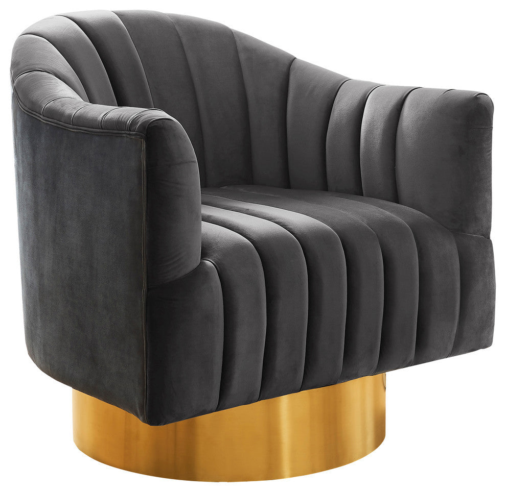 Farrah Velvet Upholstered Accent Chair, Gray, Gold Swivel Base
