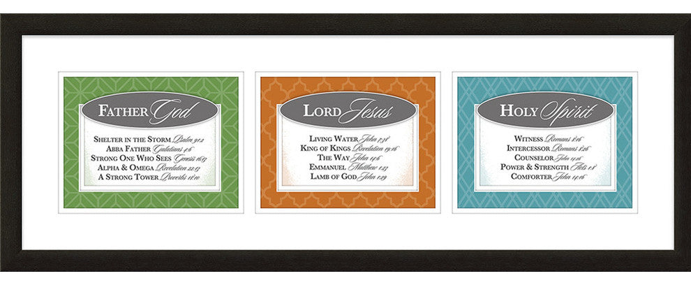 Father God; Lord Jesus; Holy Spirit, Colorful Classic Collection framed art offers timeless words of scripture to give hope and strength for today. Perfect for any home decor!