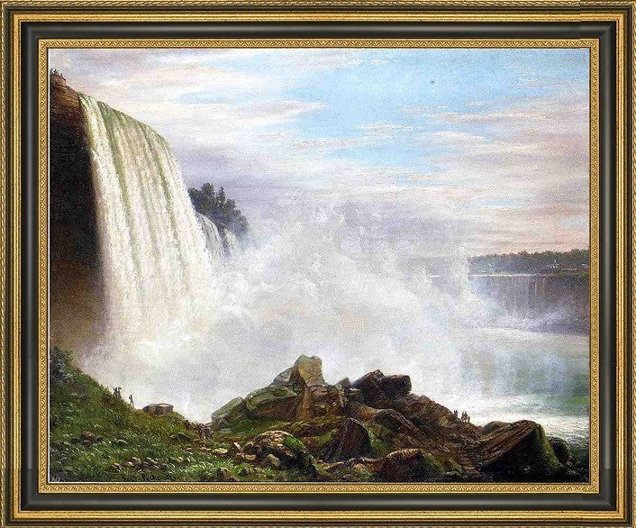 20" x 25" Ferdinand Reichardt Niagara Falls framed premium canvas print reproduced to meet museum quality standards. Our Museum quality canvas prints are produced using high-precision print technology for a more accurate reproduction printed on high quality canvas with fade-resistant, archival inks. Our progressive business model allows us to offer works of art to you at the best wholesale pricing, significantly less than art gallery prices, affordable to all. This artwork is hand stretched onto wooden stretcher bars, then mounted into our 3 3/4" wide gold finish frame with black panel by one of our expert framers. Our framed canvas print comes with hardware, ready to hang on your wall. We present a comprehensive collection of exceptional canvas art reproductions by Ferdinand Reichardt .