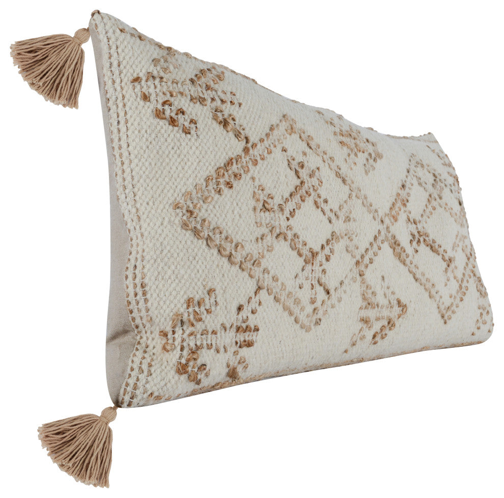Featuring an understated yet elegant pattern in soft, neutral hues, this pillow infuses timeless beauty into any room. Four corner tassels add a touch of flair and movement to the look.