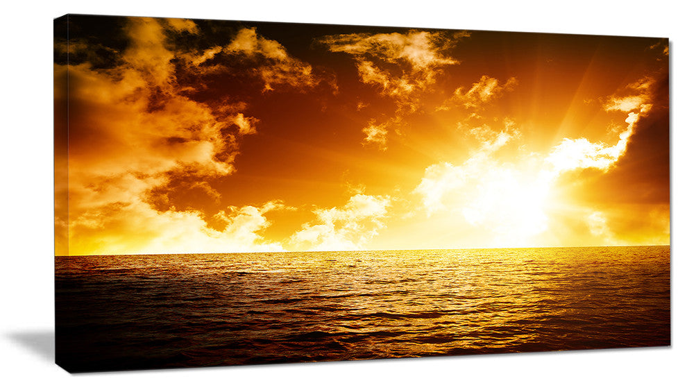 The Fiery Sunlight in Beach during Sunset canvas art print is sure to make an impression on anyone who sees it. This artwork is gallery wrapped around a 1-inch solid wood frame and arrives carefully packaged and entirely ready to hang on the wall. Design Art only uses the highest resolution and pigments to ensure a crisp colorful print that is never faded or pixelated. This artwork is sure to be a conversation starter in any home or office.