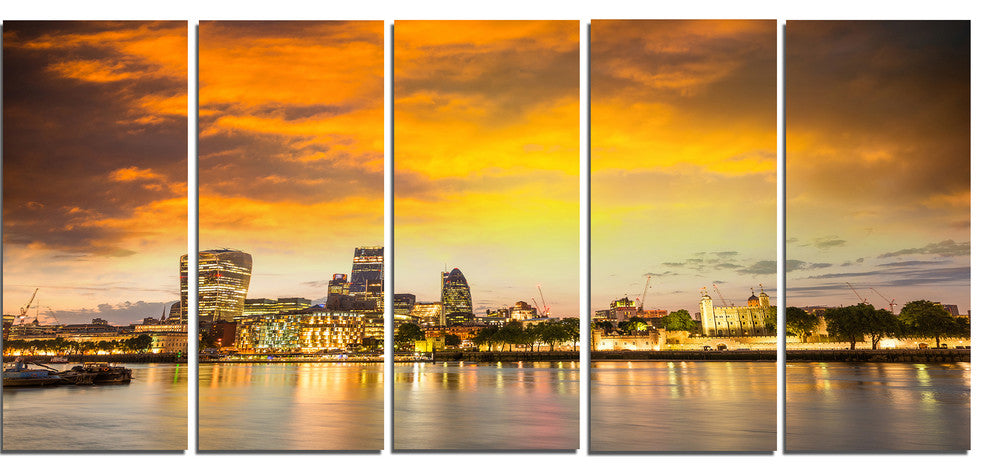 "Financial District of London at Twilight" Cityscape Wall Art, 60"x28", 5-Panels