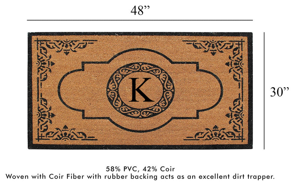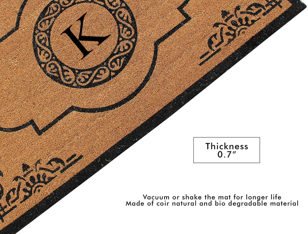 Decorative mat is great for any season and beautifies your doorstep. Durable and dirt resistant, its beautiful pattern will make a great first impression on any guest. Made from 100% natural coir fiber this durable mat provides exceptional brushing action on footwear with excellent water absorption.>NATURAL COIR PILE: It is made from 100% natural coir fibers which are one of the strongest fibers and they naturally trap dust and other particles, and also act as a natural bug repellent. Initial Shredding is natural with coir mats which get reduced with time and use.>100% VINYL BACKING: This provides an anti-slipping effect. Biodegradable mat resists mold and mildew.>ATTRACTIVE DESIGN AND ANTI SHRED TREATMENT: This is a personalized design and every mat is Hand monogrammed individually in the USA. Each mat is finally applied with anti-shred treatment which helps reduction in shredding.>OUTDOOR USE UNDER COVERED AREA: The product can be used outside under covered areas only. Do not expose directly to rain and sunlight. Can be used at any entryway/ door front. Built to last, the durable material will withstand any weather condition.>LOW MAINTENANCE: Coconut coir is naturally resistant to bacteria and fungi, making this the most low-maintenance doormat possible. It is also water-resistant, and will dry quickly so you won"™t need to worry about mildew or molds. Simply shake it out or vacuum regularly for longer life, and let the coir do the rest.>MAKES A GREAT GIFT: As the Door mats are personalized it can make a great remember able gift >Only for use in covered outdoor areas. Do not expose directly to sunlight or rain.