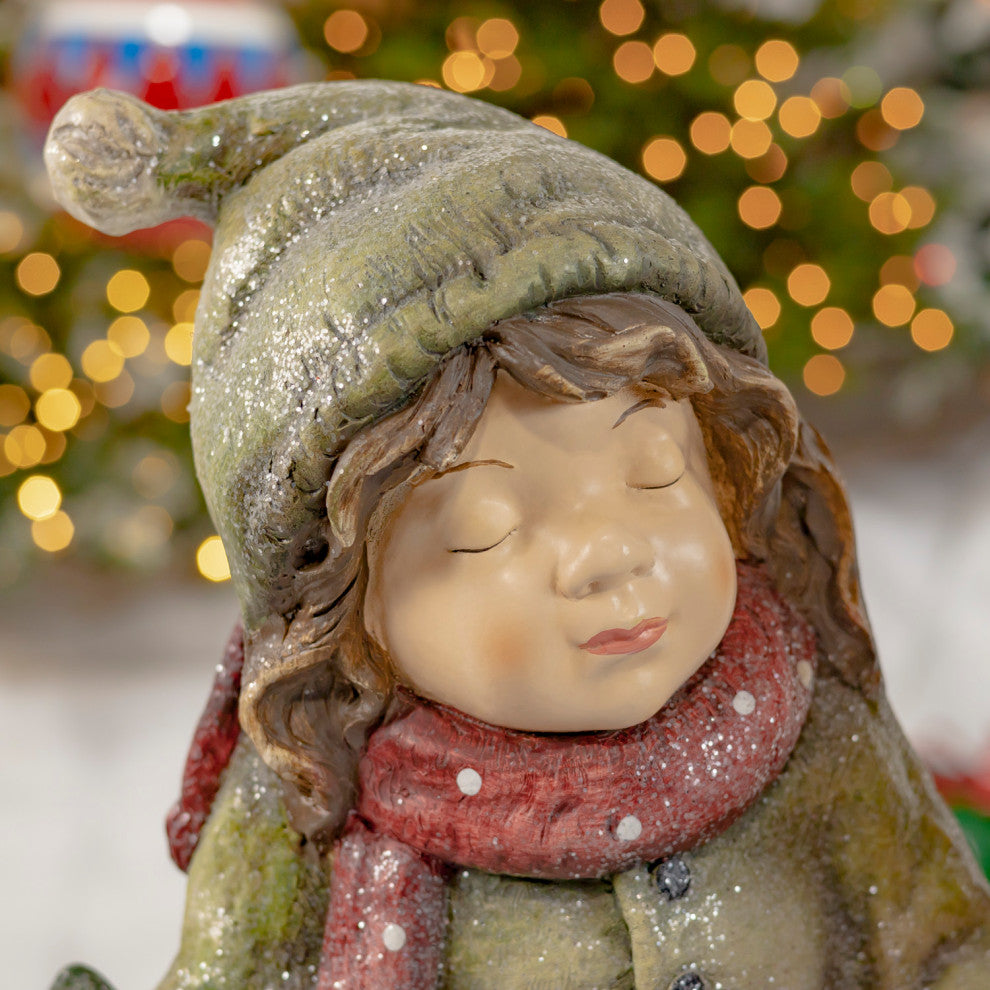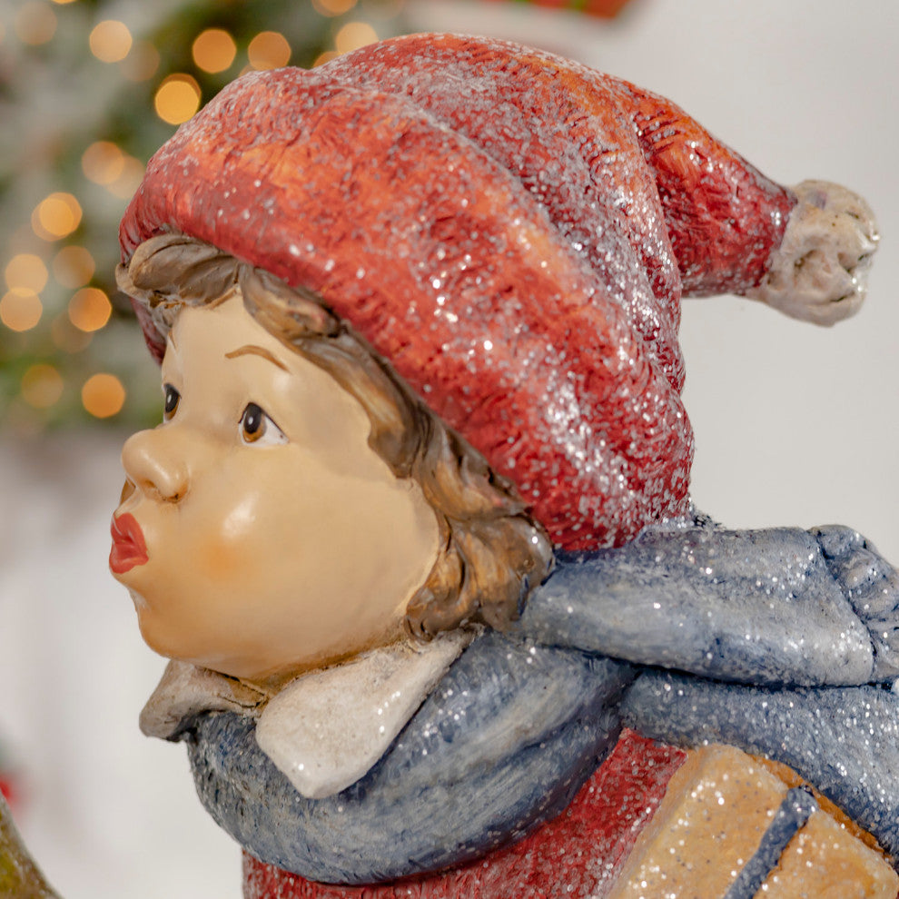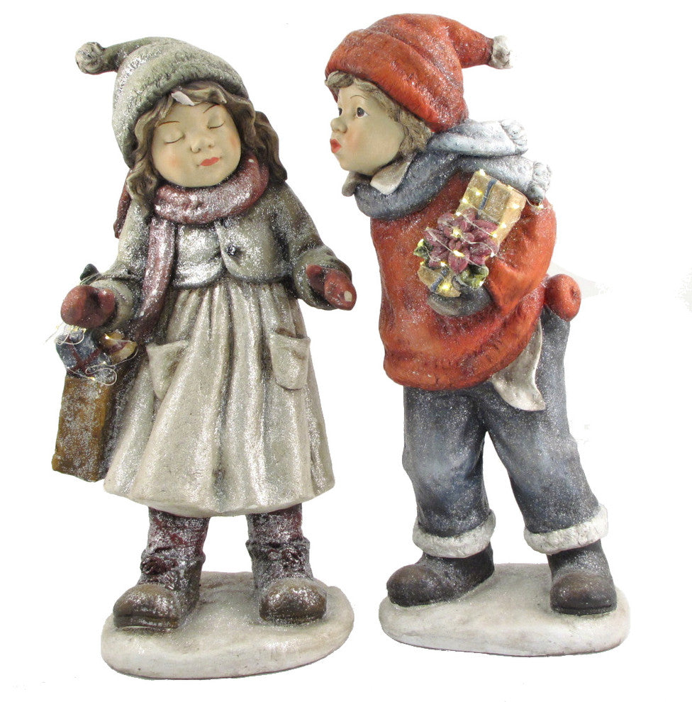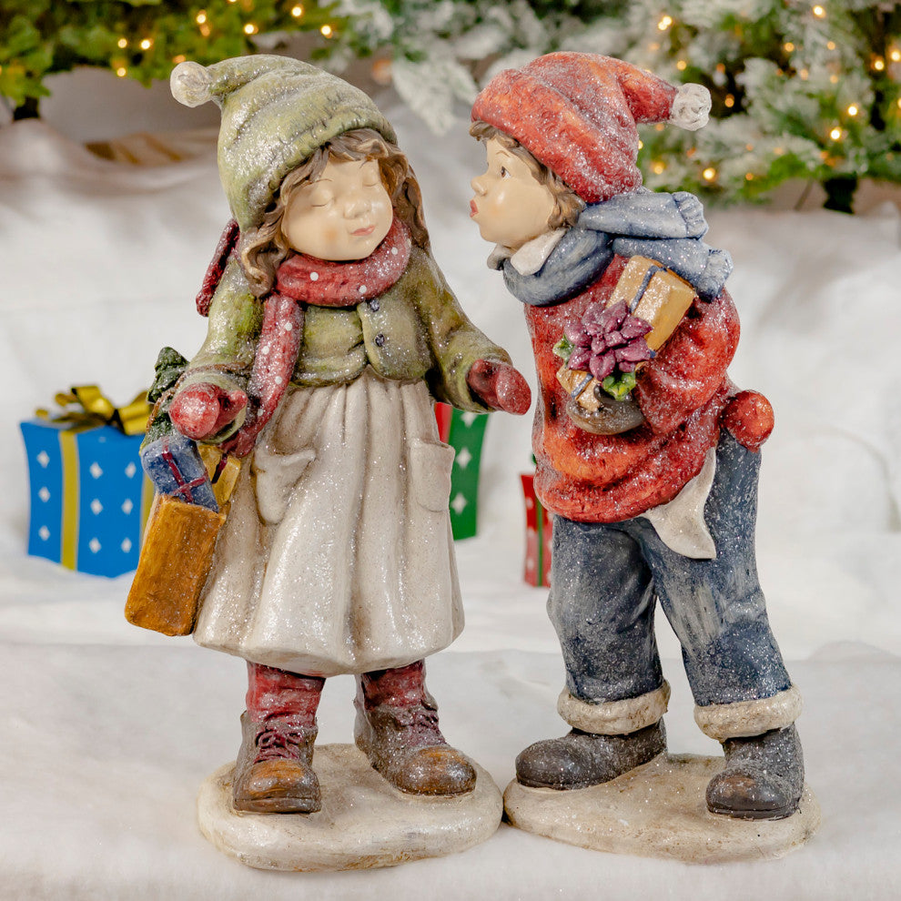 Last season we introduced our Christmas Tushka Collection and it was a HUGE success. So this year we expanded the line and switched up the style a bit based on what our customers wanted.Nothing is cuter than two children sharing their first innocent kiss and this set is sure to have you customers saying "Awww" as soon as they see it. Like all of our Tushka figurines, this adorable girl and boy are made of magnesium so they are solid yet maintain a whimsical beauty with each having well-defined details such as texture and clothing. They make the perfect holiday or winter display whether in your front window or scattered throughout your home. Our Tushkas are even safe for outdoors though we suggest a clear over-spray to reduce possible fading. Product Dimensions: Girl: 11"x10"x27"T; Boy; 14"x11"x26"T