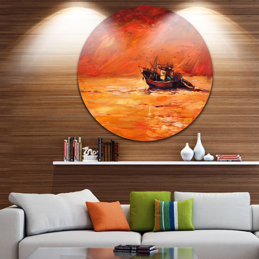 Fishing Boat In Red Hue, Seascape Panting Round Wall Art, 11"