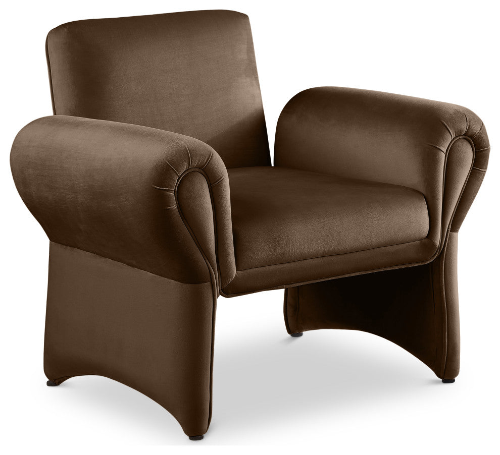 Kick back in this Fleurette velvet accent chair to get comfortable and cozy after a hard day at the office. Soft brown velvet upholstery covers every square inch of this lovely chair, making it the perfect spot for curling up with a bestseller or just relaxing. An iron frame and foam padding add to the chair''s long-lived beauty and performance, and the curved arms make for an uber contemporary look. The chair''s design allow lots of clearance below for cleaning.Overall Product Dimensions: 36.5" W x 28.5" D x 31" HSoft Brown VelvetCurved ArmsContemporary DesignSeat Dimensions: Seat Width: 20.5"Seat Height: 18"Seat Depth: 21.75"Arm Height: 23.5"Back Height: 13"