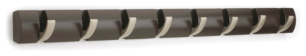 -Wall mounted wood with flip down hooks.Umbra''s signature wall mounted hook with 8 flip down hooks to hang clothing articles and accessories.Flip hooks upward when not in use for a cleaner, tighter estheticHidden mounting hardware for a seamless look. -Hardware includedHold up to 5 lbs. per hook. (2.3 kg)Great for small spaces.Measures 33 1/4 x 2 3/4 x 1 1/2" (84.5 x 7 x 3.8 cm)Dimensions: 33 1/4 x 2 3/4 x 1 1/2"