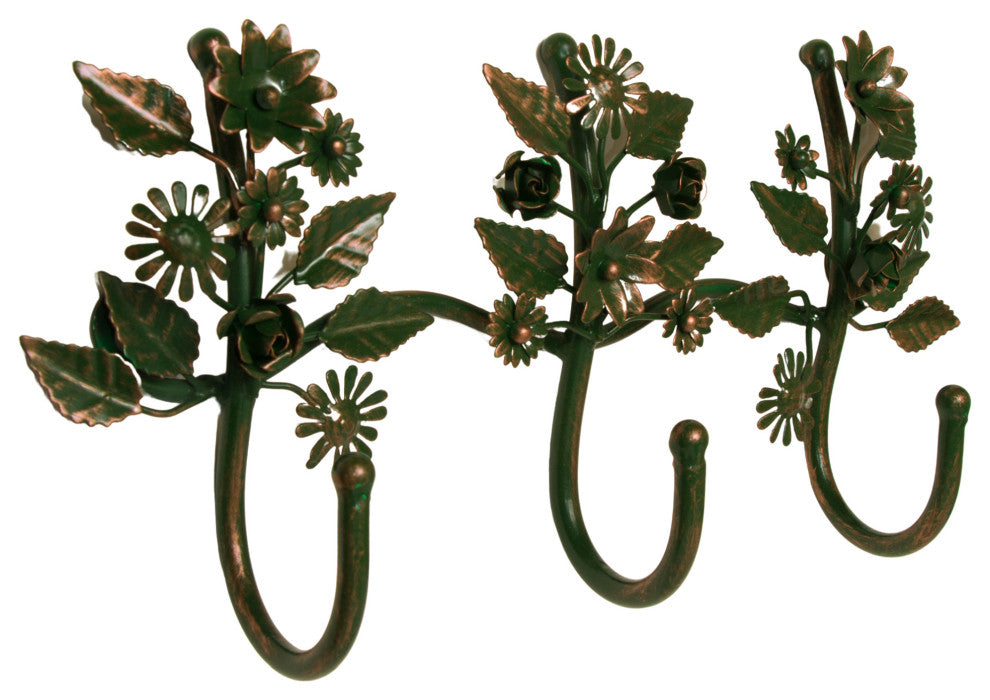 This floral wall hook comes with three hooks and features a jungle green finish with hints of copper. The hook has two key-hole hook on either ends for easy mounting. This floral wall hook will look great in your kitchen, foyer or laundry room. The hook is made of iron and the flower and leaf edges have been blunted and rounded off.Also available in Whitewash finish.Mounting hardware included.Hook Dimensions: 7.25"� Height x 14"� Width x 3.00"� Depth