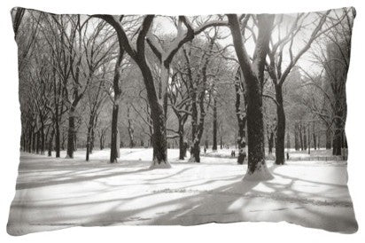 A time to reflect. The boundless beauty of a winter landscape. Add a resplendent touch to your décor with this captivating accent pillow. Portraying classic winter scenes of Central Park blanketed in freshly-fallen snow, our Winter Park custom pillow collection is a charming nod to the simple joys of the season. Printed on raw silk taffeta with a velvet backing, these custom pillows impart effortless appeal to any room. This collection hand-made by Tempo Luxury Home in New York. Fill: 75% goose down; 25% feather. Zippered pillow. Made to order.