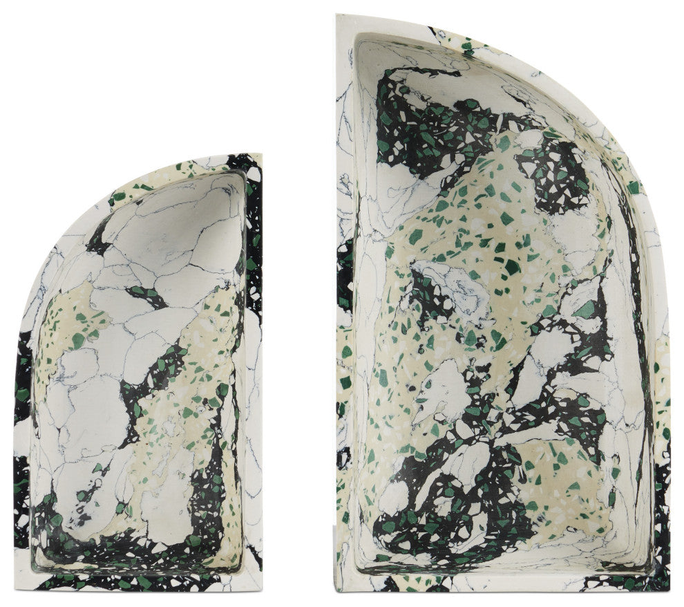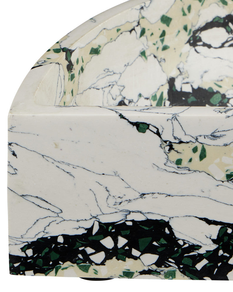 The Fossey Asymmetrical Tray looks like natural granite, but it''s actually made of synthetic stone. The black and white decorative tray with hints of green and pale yellow has a swirling personality that makes it a textural accent. The one curved edge brings it an interesting profile.