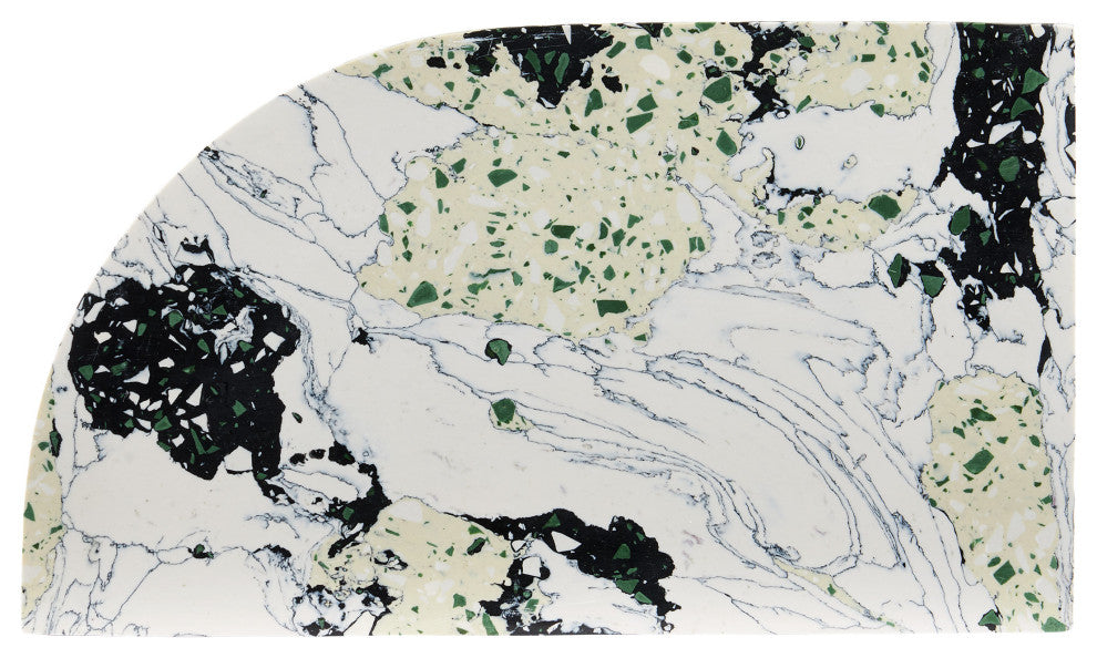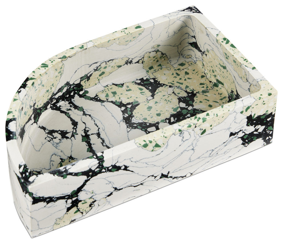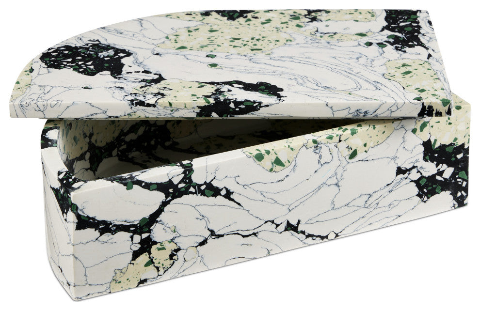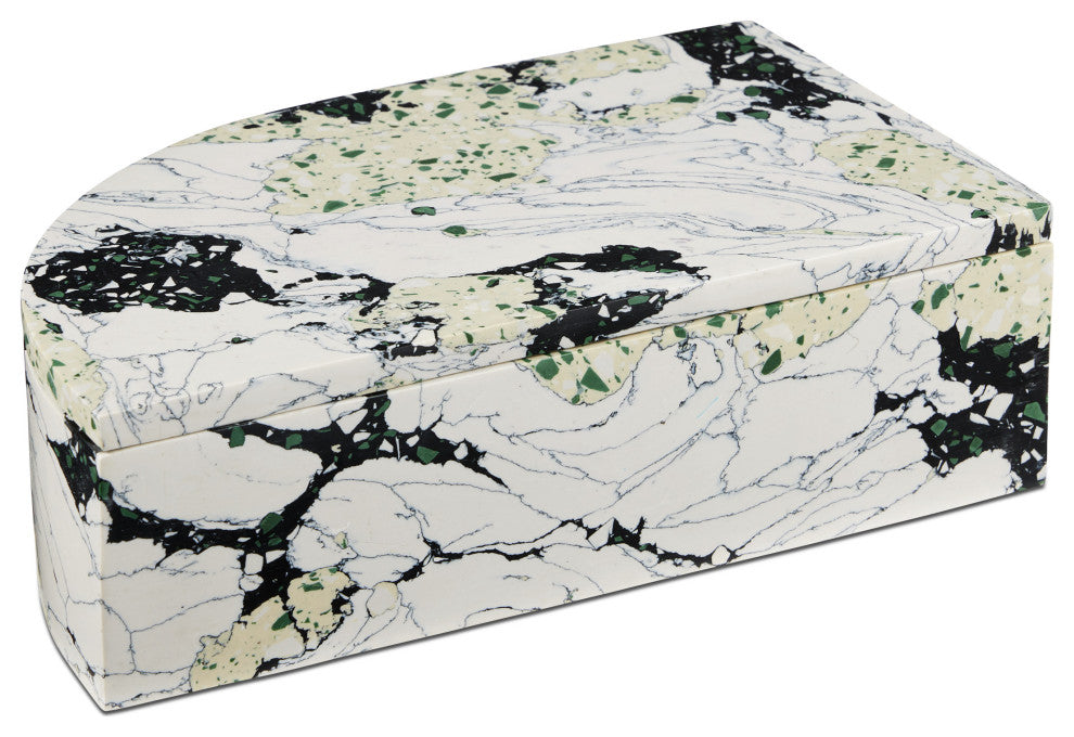 The Fossey Rectangular Box looks like natural granite, but it''s actually made of synthetic stone. The black and white decorative box with hints of green and pale yellow has a swirling personality that makes it a textural accent. The one curved edge brings it an interesting profile.