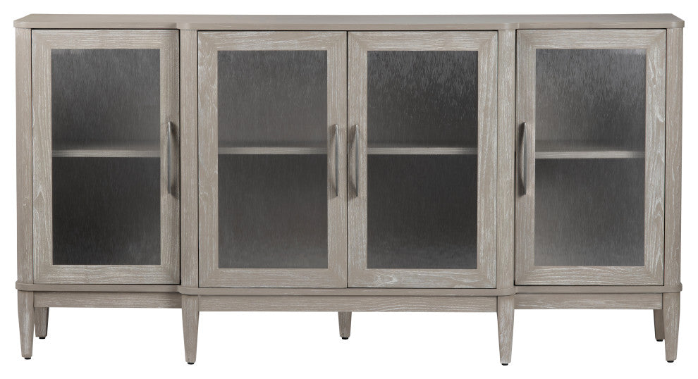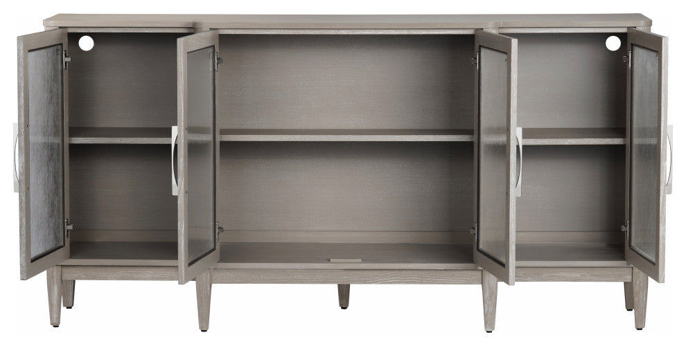 Elevate your living space with this elegant four-door sideboard. Crafted from durable rubberwood and white oak veneer, it features tempered glass panels for a refined look. Finished in a khaki tone with light undertones, it includes four doors with European hinges, three adjustable interior shelves, and cord management holes for versatility. Built-in floor levelers and a tipping restraint ensure stability. Minor assembly required to attach the feet, making it both stylish and practical for your home