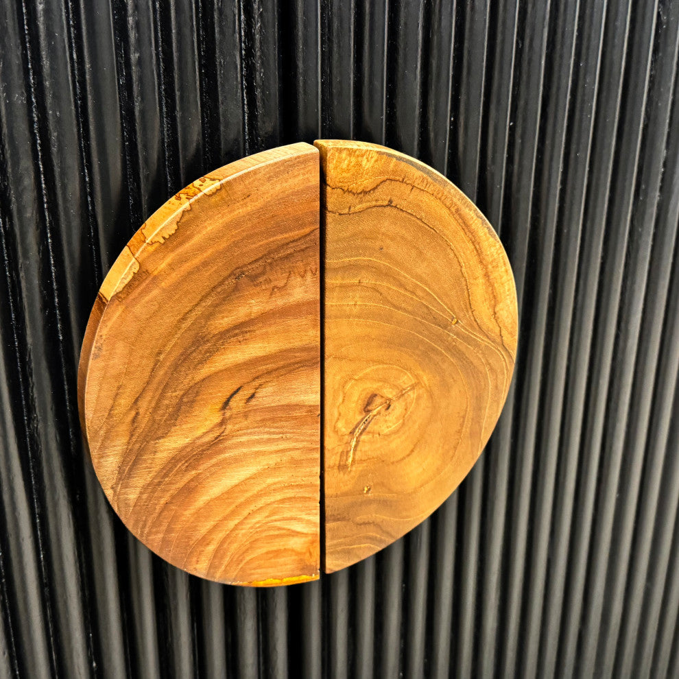 This four-door media credenza/sideboard is a sleek rectangular piece crafted from wood in a rich black stained finish. Its front features four wooden doors with upgraded European hinges and magnetic closures for smooth functionality. Two sets of oversized wood pulls stand out as striking design elements, showcasing a natural wood grain finish and a circular split design that adds visual interest. Inside, two compartments with fixed interior shelves provide ample storage, making this a perfect blend of form and function