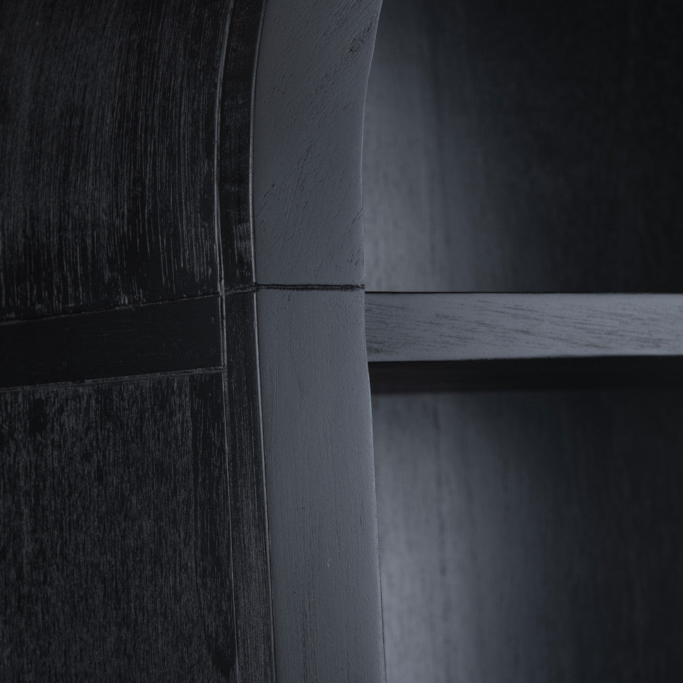 Add sophistication to your space with this sleek black ''tagere. Crafted from durable Mindi wood, it boasts a painted black finish that enhances its modern appeal. The arching top and clean lines create a timeless design, while five fixed shelves provide ample space for books, decor, or storage. Ready to use right out of the box, it includes optional floor levelers for added stability on uneven surfaces. This elegant piece combines functionality with style, perfect for any room
