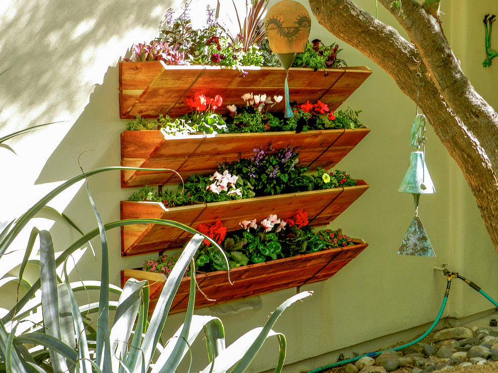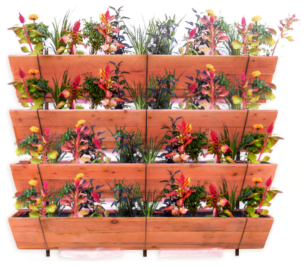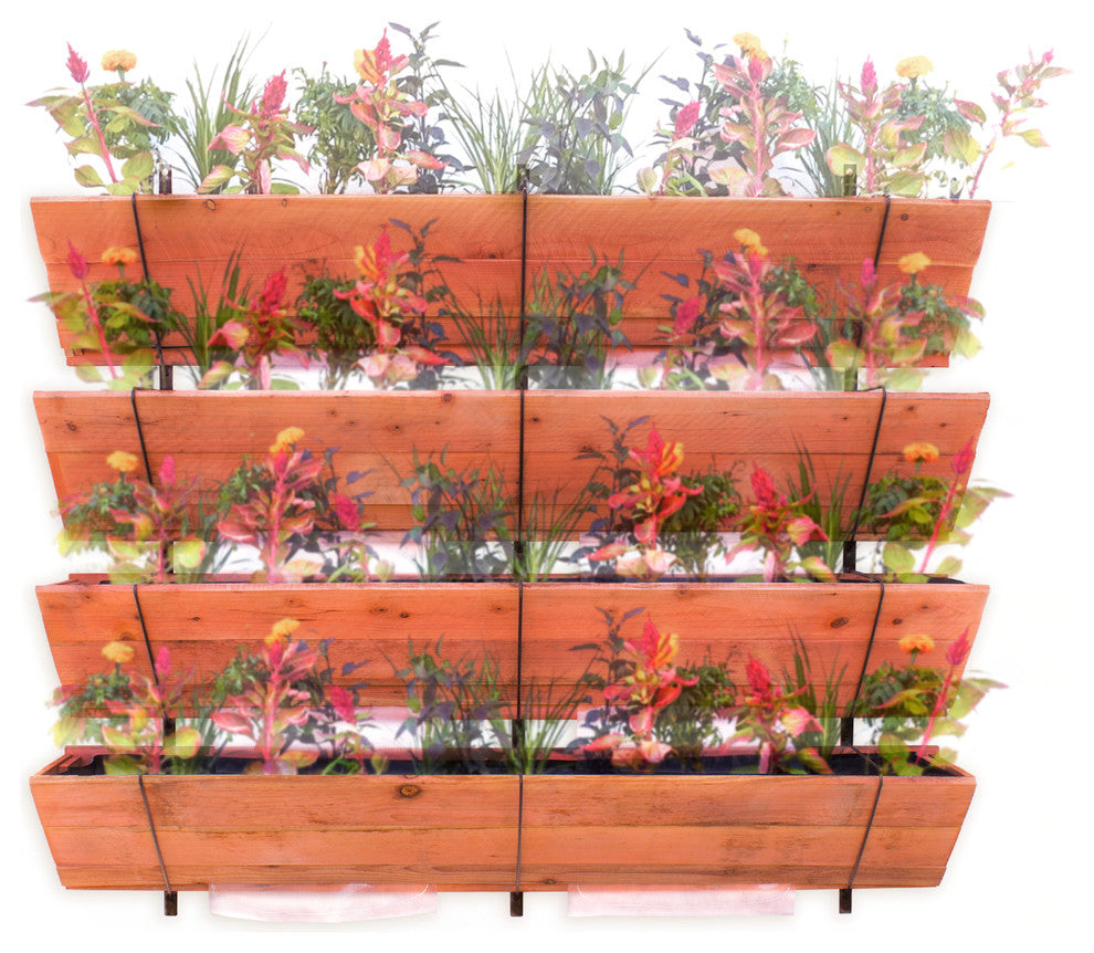 The design of Flower Street Urban Gardens refines the simplicity, durability, functionality, and the aesthetic of what a superior vertical garden should be. Its modular design offers a range of versatile options including the ability to be hung in groups to create a lush living wall. This is a full scale vertical garden that doesn"™t mess around. It brings you all of the practical design features that allow you to produce stunning aesthetic impact. If you"™re looking for a system that has the capacity to grow full sized vegetables in a small space then look no further. In practical application, alternative products can easily stain or erode surfaces. Other systems have limited space for root systems which limits what vegetables (if any) you can grow. Each unit is designed to drain excess water down through its tiers. The bottom drip edge can be angled to direct the water run off away from walls so no calcification or staining occurs. The materials include red cedar which is naturally rot resistant and has an impressively low carbon footprint. Each tier is lined with a BPA free, agricultural grade food liner. The liners are perforated to facilitate the drainage as well as keeping the soil separated from the wood facade. Each bolt-on unit uses three steel mounting brackets to allow the unit to attach directly onto any sound vertical structure. These frames have a designated hole on the top and bottom of the mounting bracket to adhere the unit using the bolts we provide, ensuring ease of assembly and strong structural support.Easy DIY assembly Features a warm aesthetic and is handicap accessible. Meets the needs of novice gardener and the master gardener alikeDesign is decorative and functional making the most out of your space by growing verticallyGreat for growing vegetables, herbs, flowers and succulents on your wall or fence