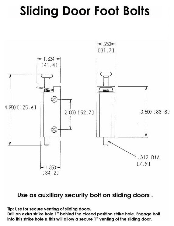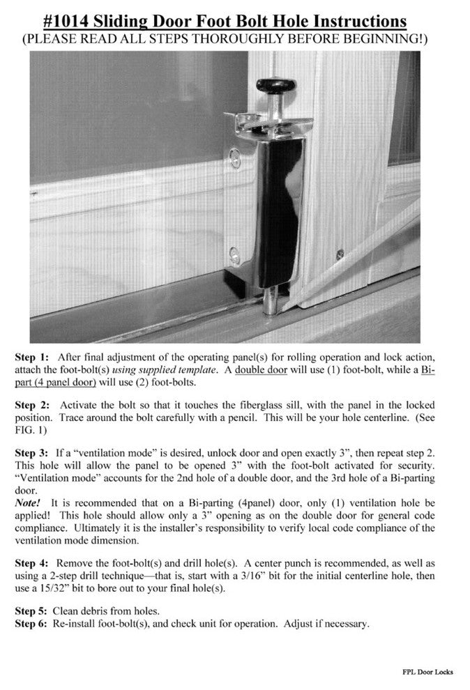Another use: Use the foot deadbolt to securely vent your sliding door. Have access to fresh air without compromising your home security. How? Drill an additional strike hole on the bottom door sill, not more than 1 inch behind the strike hole used when the door is closed and locked. To securely vent, open the sliding door until the bolt can enter the second strike hole then press the deadbolt down. Your sliding door is now vented and entry is minimized to 1 inch.
