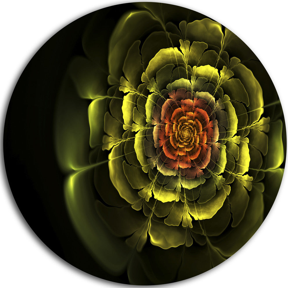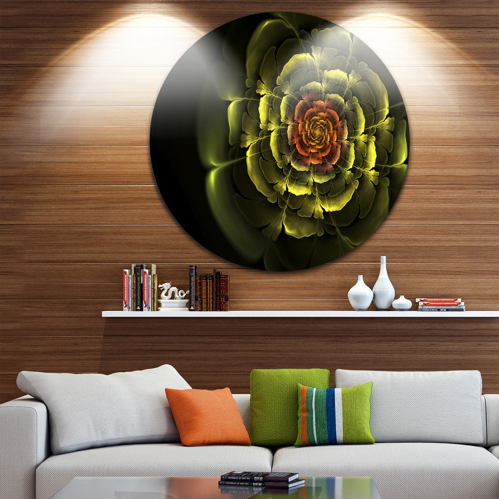 Bring Contemporary Abstraction to your home with this large Circle Metal wall art. This Fractal Yellow Rose in Dark Metal Artwork makes it the focal point of any room or office.