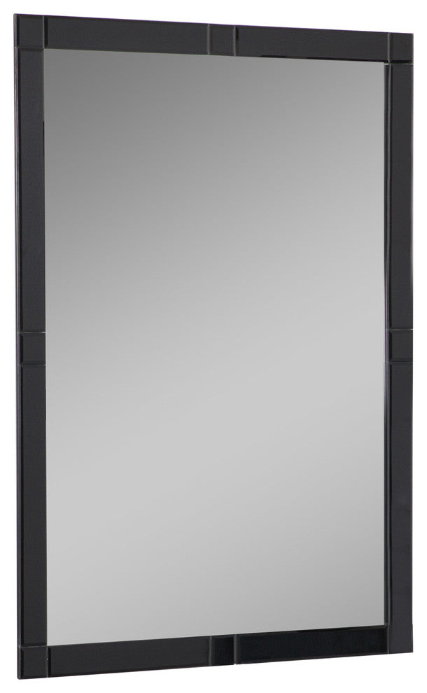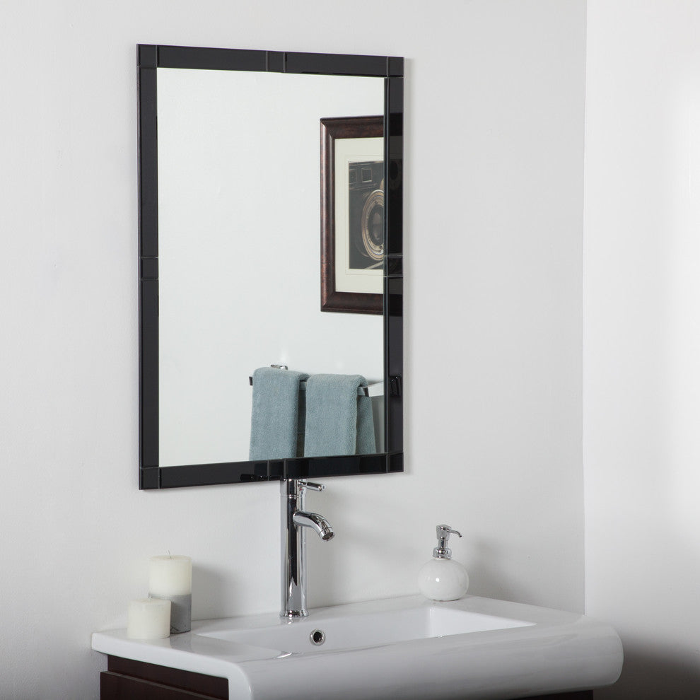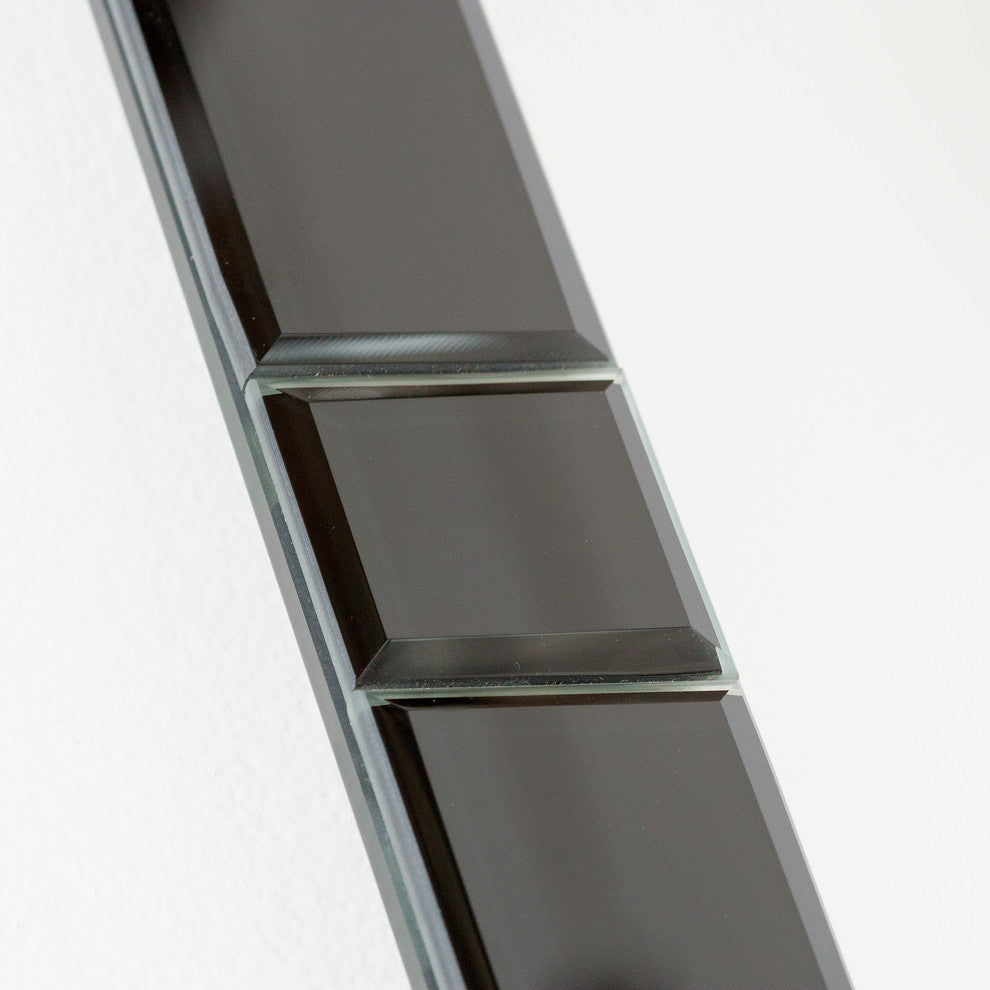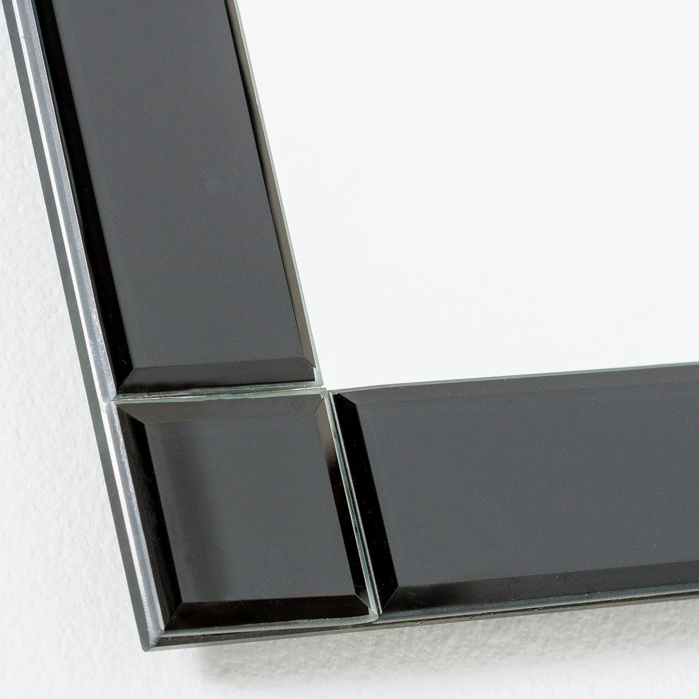 Visualize yourself in front of this beautiful and contemporary large frameless wall mirror comprised of 16 black hand beveled mirrors. Perfect wall mirror for your hallway, living room or unique modern bathroom vanity. The unique black mirrors on the border are cut and beveled by hand so they may not be perfectly symmetrical.- Crafted from 2 layers of thick, strong 3/16 glass and metal- Double coated silver backing with beveled mirrors and seamed edges- Mounting hardware included, comes ready to hang vertically and horizontally.- Great for Bathroom mirror, Vanity mirror, Living Room mirror or Bedroom mirror- All side mirrors have a 1/4" bevel. Large side mirrors measure about 13.4"x1.6". Medium side mirrors measure about 9.4"x1.6". Small side mirrors measure about 1.6"x1.6". Center mirror measures about 20.5"x28.3".