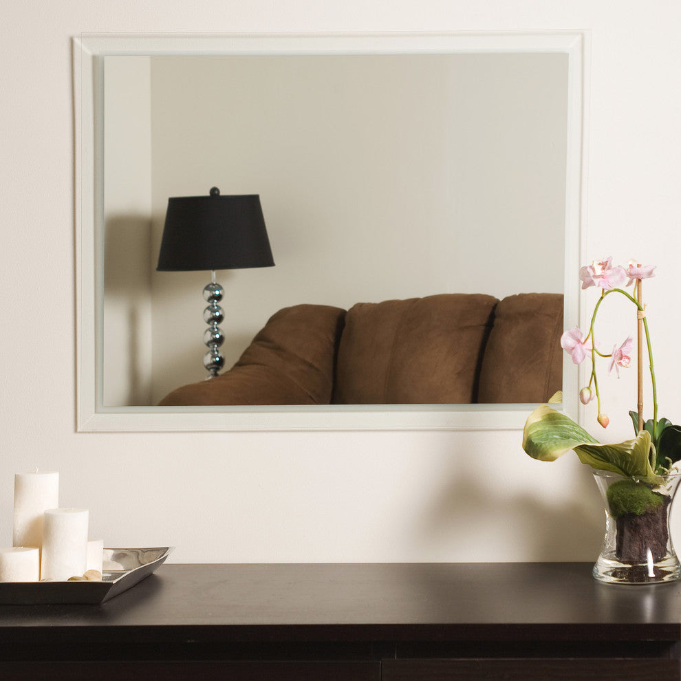 Strike a pose in front of this stylish and modern frameless wall mirror with etched design border. Perfect mirror for your hallway, living room or bathroom. - Crafted of thick, strong 3/16 glass and metal- Double coated silver backing with seamed edges- Mounting hardware included, comes ready to hang vertically or horizontally.- Great for Bathroom mirror, Vanity mirror, Living Room mirror or Bedroom mirror- Center mirror measures ~21.6"x29.5"