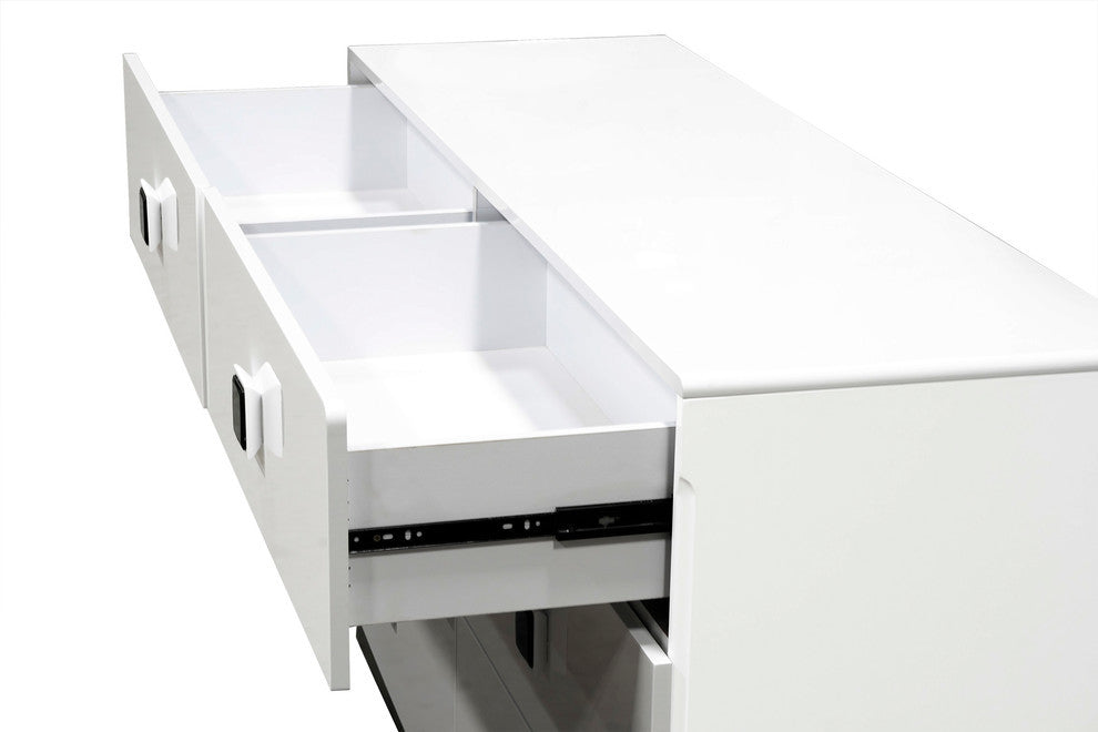 This stunning 6 Drawer Dresser has everything you are looking for. It comes in high gloss shiny white lacquer and made of poplar wood. All drawers have side metals rails and a chrome base. All these special features will turn your bedroom into a more sophisticated and modern look.Dimension:Dresser: 55"L x 17"D x 32"HColor: White Lacquer, High Gloss with Extra CodingMaterial: MDF, Lacquer, Poplar WoodIncludes: 1 Pc 6 Drawer DresserAssembly Not Required