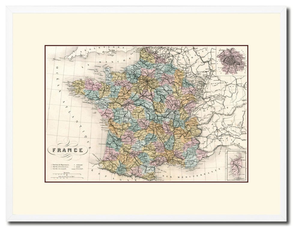 France Paris Old Map Print On Canvas With Picture Frame Art Collection 16" X 21"