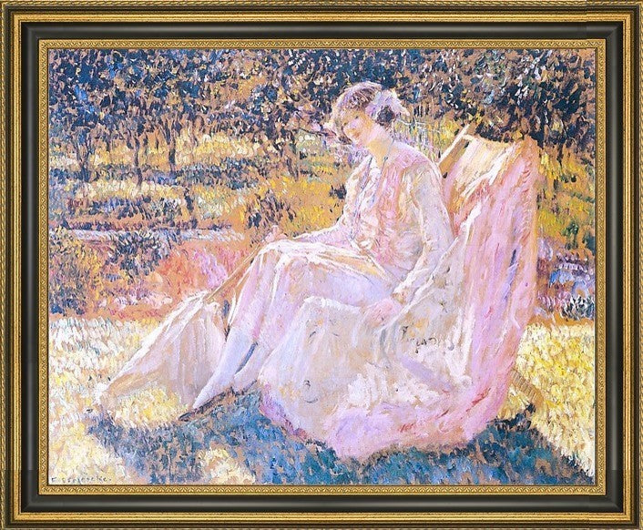 20" x 25" Frederick Carl Frieseke Sunbath framed premium canvas print reproduced to meet museum quality standards. Our Museum quality canvas prints are produced using high-precision print technology for a more accurate reproduction printed on high quality canvas with fade-resistant, archival inks. Our progressive business model allows us to offer works of art to you at the best wholesale pricing, significantly less than art gallery prices, affordable to all. This artwork is hand stretched onto wooden stretcher bars, then mounted into our 3 3/4" wide gold finish frame with black panel by one of our expert framers. Our framed canvas print comes with hardware, ready to hang on your wall. We present a comprehensive collection of exceptional canvas art reproductions by Frederick Carl Frieseke.