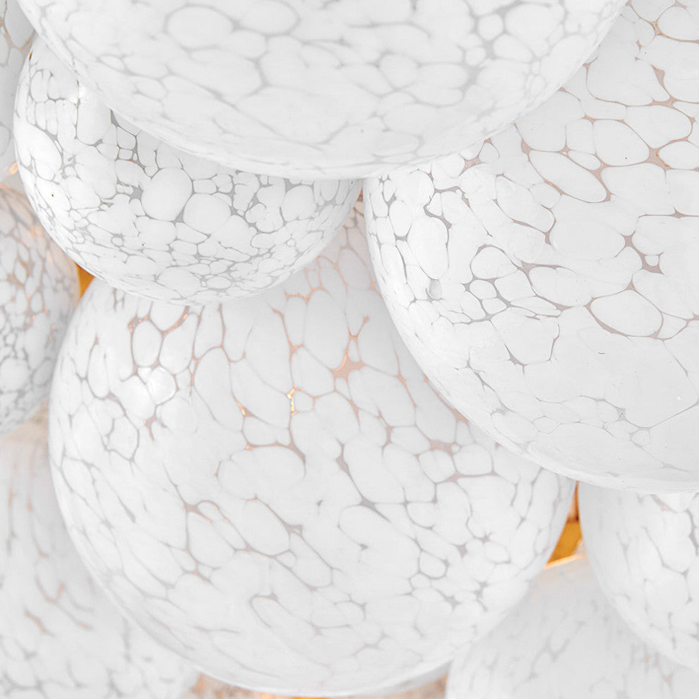 A stunning cluster of hand-blown art glass spheres adorns Marabel''s luxe design, creating an elegant shade of enchanting illumination as warm light is diffused from candelabra lamps. The conical metal frame in a classic Distressed Brass finish provides a complement to the etched white globes.