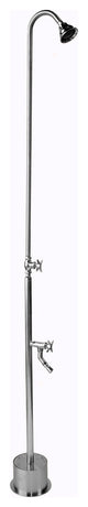 Free Standing Shower with stainless steel body Hose Bibb3" shower head with pivotal ball joint Chrome plated brass cross handle valveSingle supply for cold or mixed waterHeight: 82" 6" diameter baseComplete with installation hardware