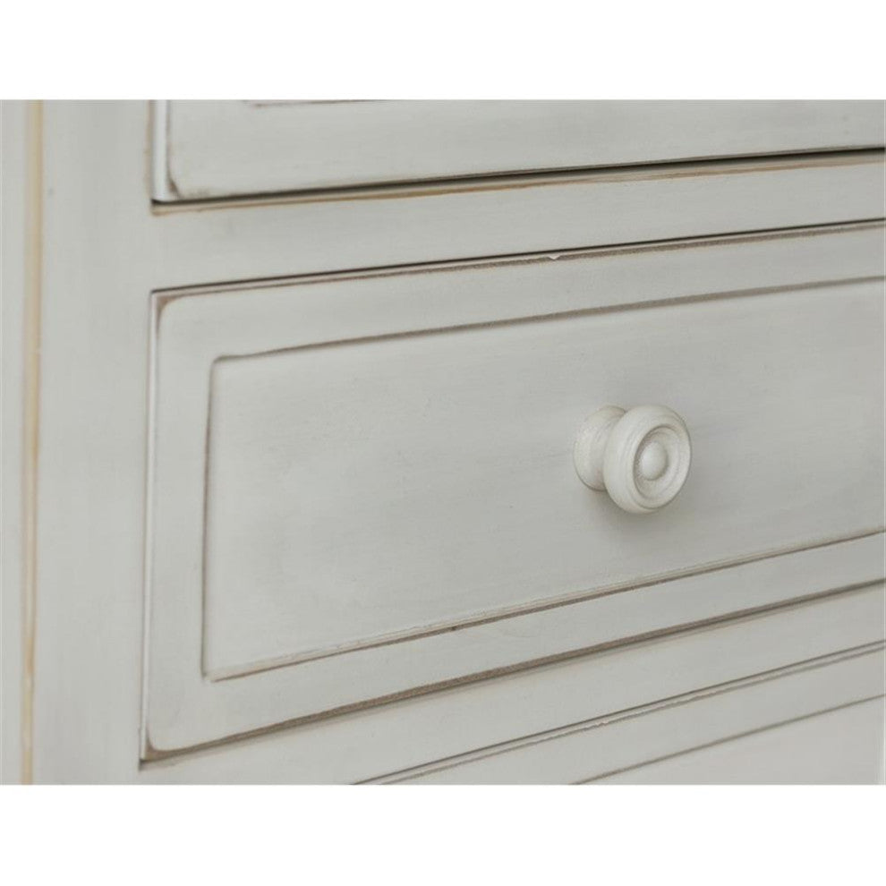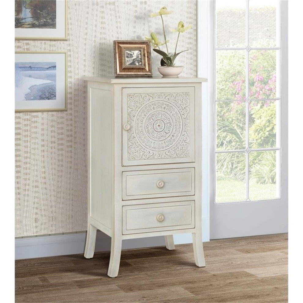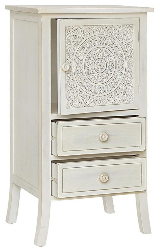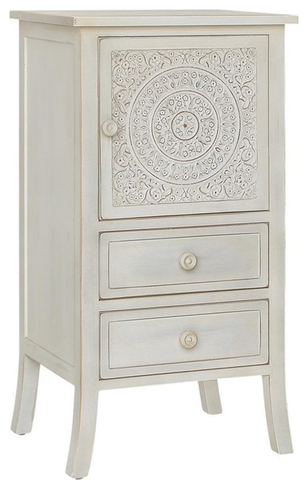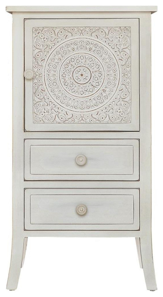 The Antique Carved Collection captures the ornate antique look of long ago with an updated yet transitional eclectic look. Sturdy wood construction with beautiful neutral white wash finish works perfectly with the color scheme of your home. Detailed carved look with circular design on doors accentuated with understated framed drawers all providing ample concealed storage. Perfect addition to your bedroom, den, living room, and hallway or entryway. Arrives completely assembled.Features: • Material: Wood • Finish: White • Carved wood design • One cabinet and two drawersSpecifications: • Product Dimensions: 34.5"H x 18.25"W x 14.5"D • Product Weight: 27 lbs • Leg Dimensions: 6.75"H • Product Dimensions: (Door) 13.5"H x 13.5"W • Number of Drawers: 2