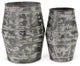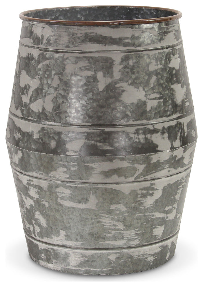 Tall and handsome, these handcrafted barrels add vertical dimension and raw texture to any space. Tuck your garden tools neatly away, or go green with potted plants for a bit of year-round color. Nest to save space Galvanized sheen Easy to clean Use a liner with plant life Numerical style print Large: 15"x7"x10" Small: 14"x6"x9"