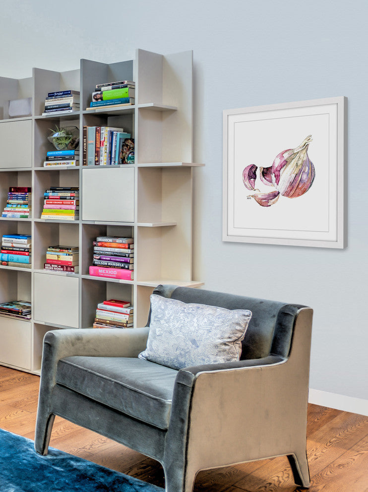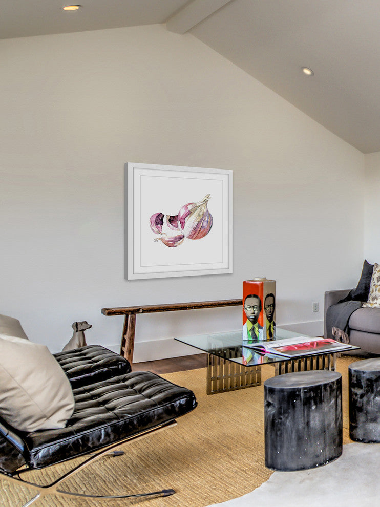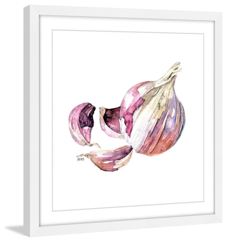 "Garlic Clove" Framed Print by Rachel Byler features vivid tones and supple artistry. Mounted in a gorgeous frame, this 32 inch wide by 32 inch tall piece will be an exceptional addition to any room. Top quality Giclee print on high resolution Archive Paper Artwork by Rachel Byler Professionally framed and mounted on acid free archive matte High quality durable non-warping frame Arrives ready to hang Includes a certificate of authenticityMade in the USAArtist signature on the front