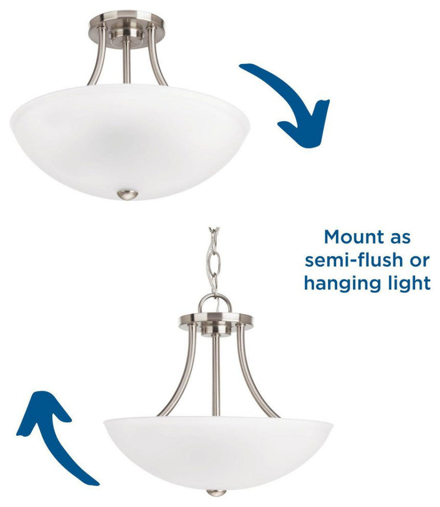 Can be mounted as a semi-flush light fixture or as a hanging light fixture