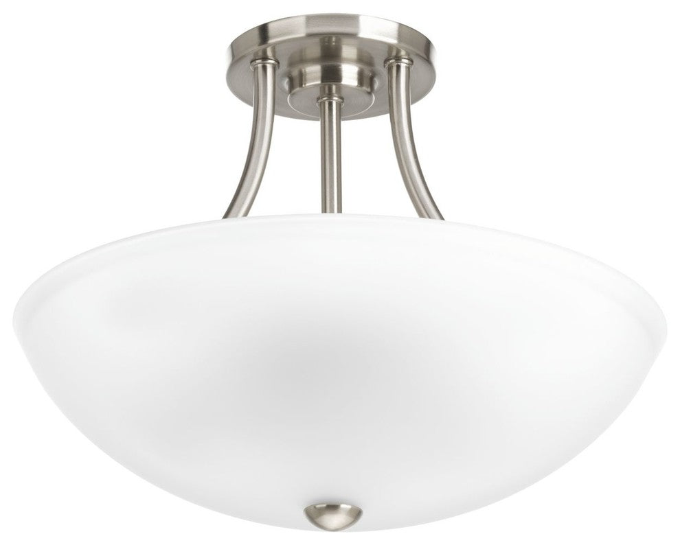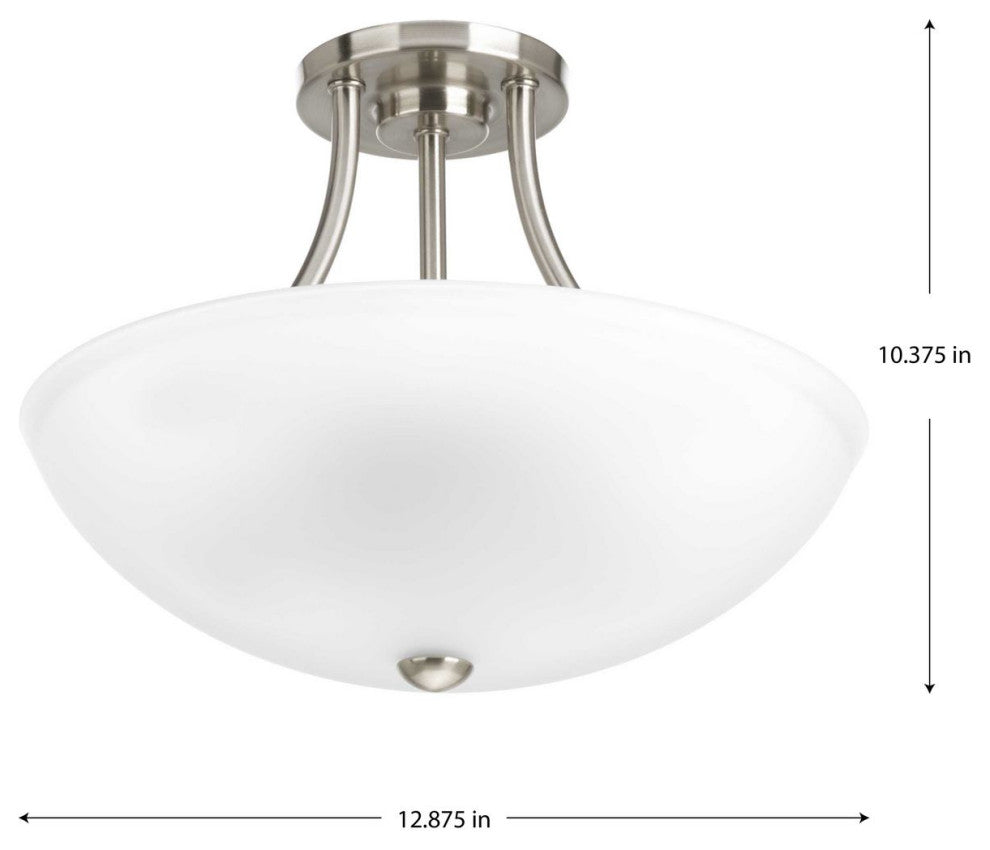 Two-light semi-flush/convertible from Gather possesses a smart simplicity to complement today''s home. Brushed Nickel metal arms descend downwards and curve sharply to prop white etched glass shades. Etched glass add distinction and provide pleasing illumination to your room. Coordinating fixtures from this collection let you decorate an entire home with confidence and style.