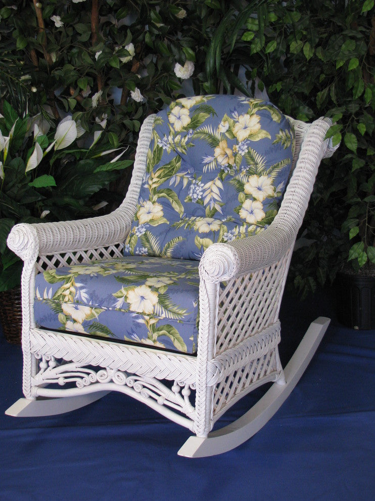 Very Victorian Gazebo Collection restores the high quality Heywood Wakefield Wicker of Yesteryear for Today''s Hi Tech Generation. Curly cues and all, this is a must have for that fine sunroom you have just built. Gazebo Rocker In White With Cushions. Please refer to fourth image for fabric swatch. Toss pillow not included.
