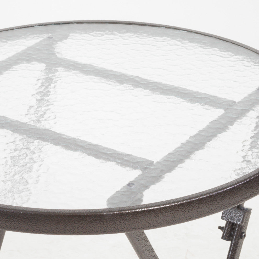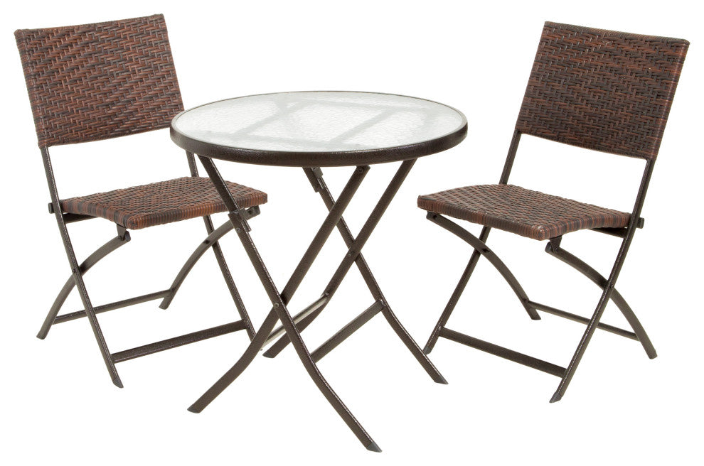The Cantinela 3-piece folding bistro set is ideal for any outdoor space. The pattern on the chairs adds eye catching detail, while the table remains simple for functionality. All three pieces fold flat, making the set easy to store and transport without compromising its sleek lines and visual appeal. Constructed from all-weather brown PE wicker and steel materials. Contemporary style will add elegance to your backyard or patio. Folds flat for easy transport; ideal for additional seating, picnics or camping. No assembly required; comes ready to use. Neutral colors to match any outdoor decor.Chair: 23.50" D x 18" W x 32.25" HTable: 28" D x 28" W x 29" H