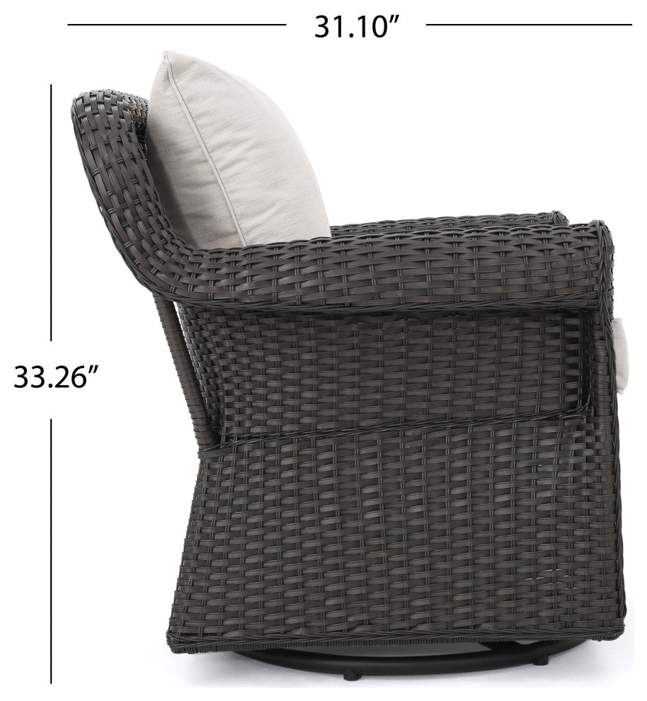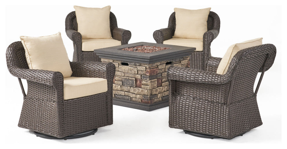 Enjoy your backyard again with this rocking chairs and fire pit set. You can enjoy the heat of the fire during the cool nights, allowing you to spend all day and night in your backyard space. Made with top quality wicker and water resistant fabric cushions, these rocking chairs will have you loving your backyard again. The fire pit is made with top quality material that is sure to have all of your friends asking you where you got your set.Features:Includes: Four (4) Chairs and One (1) Fire PitChair Material: Polyethylene WickerCushion Material: Water Resistant FabricFabric Composition: 100% PolyesterFire Pit Material: Magnesium Oxide and SteelFrame Material: Iron and AluminumWicker Finish: Dark BrownCushion Color: BeigeFire pit finish available in: Stone or BrownNo Assembly RequiredFire Pit Dimensions: 32.20"D x 32.20"W x 23.80"HChair Dimensions: 32.28"D x 31.10"W x 33.26"HSeat Dimensions: 23.50"D x 21.00"W x 15.75"HArm Height: 26.00 inches