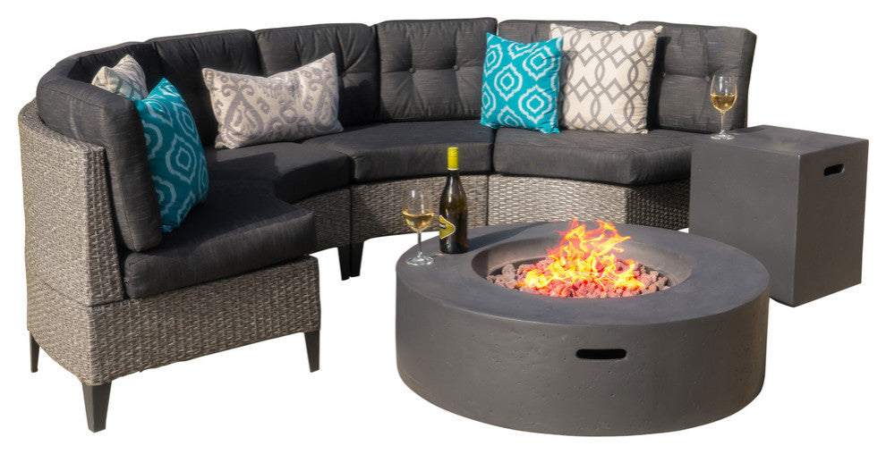 Stay warm by the fire and have comfortable outdoor seating all within one complete purchase. Featuring seating for 4 with this half round sectional sofa set and a stylish gas fire table as your center piece, you will love hosting outdoors all summer long.Features:Includes: Four (4) Quarter Sofa Seats, One (1) Fire Table, and One (1) Tank HolderSectional Sofa Material: Polyethyne WickerSectional Sofa Cushion Material: Water Resistant FabricFabric Composition: 100% PolyesterFire Table Material: MGOWicker Finish: Mixed BlackCushion Color: Dark GrayFire Table and Tank Color: Dark GrayEasy To AssembleDimensions:Sectional: 27.50" D x 40.50" W x 27.50" HFire Table: 39.25" D x 39.25" W x 11.47" HTank Holder: 13.78" D x 15.75" W x 20.27" H