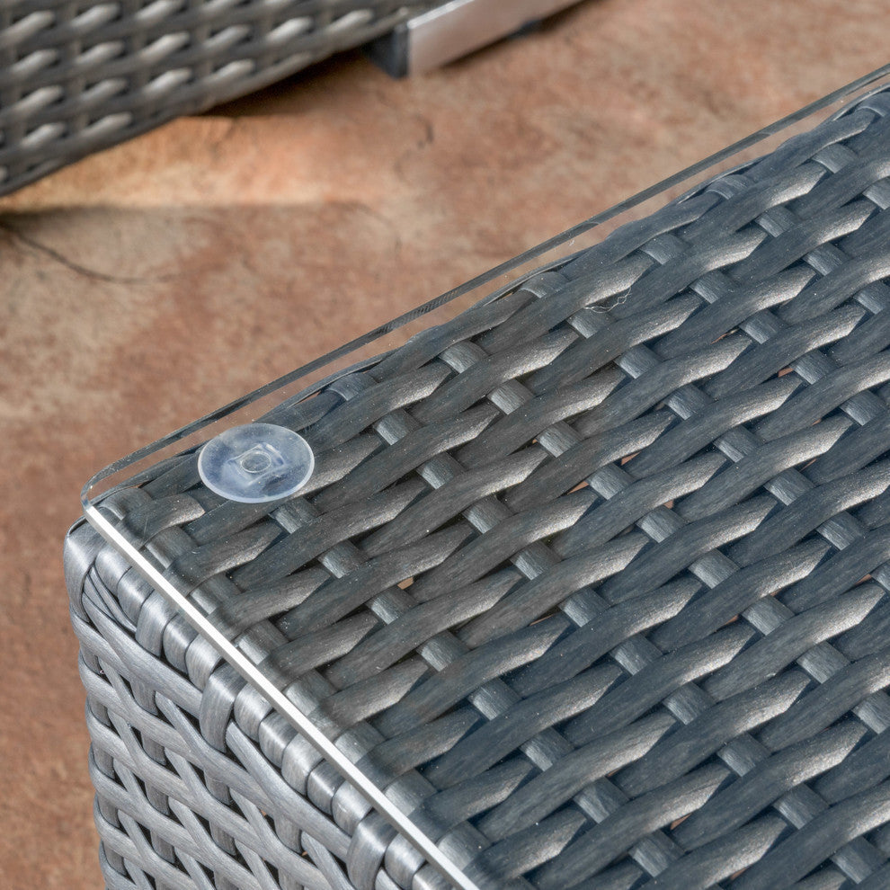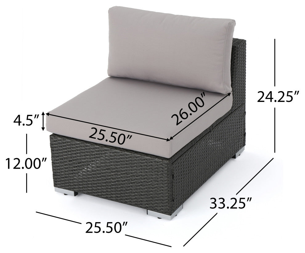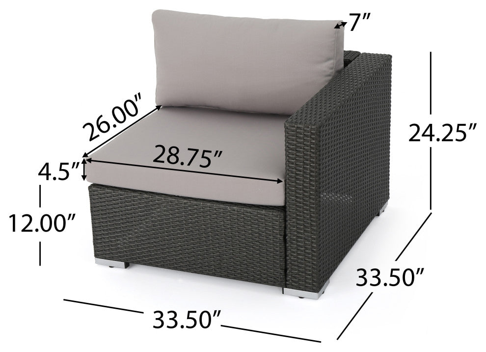 Enjoy a cozy weekend with your family in our six-seater sectional chat set that provides ample space to sit and relax in the great outdoors. This classy set features a stunning wicker weave and includes a matching coffee table with a beautiful tempered glass top. Choose between Sunbrella or water-resistant cushions for long-lasting comfort that is sure to impress. If you choose one of our Sunbrella options, the covers will be shipped separately and should arrive within 72 hours of your set.POLYETHYLENE RATTAN: Featuring a long-lasting woven finish, this style is not only incredibly durable but also provides a versatile appearance. The intricate details of this material allow this piece to blend seamlessly with your decor.ALUMINUM FRAME: This accessory is built with lightweight aluminum, creating a versatile yet durable frame. This material is rust-resistant which will further extend the life of your product.WATER-RESISTANT OR SUNBRELLA CUSHIONS: Our cushions are covered with a non-porous material that makes cleaning any spill a breeze. If you choose one of our Sunbrella options, the covers will be shipped separately and should arrive within 72 hours of your set. Please note that if you do not choose a Sunbrella set, the cushions are water-resistant and not waterproof. Please do not submerge in water.TEMPERED GLASS TOP: The coffee table for this set features a tempered glass top for a smooth, glossy look that offers a stable surface for your drinks and snacks. This glass is made to be stronger and safer than regular glass, making this more resistant to breakage and shattering.MODULAR: This sectional chat set contains separate pieces so you can arrange your furniture to your liking. The club chair is 34" W x 33" D x 24.25" H, the table is 33.25" W x 30.50" D x 13.50" H, and the five-piece sectional sofa offers a convenient modular arrangement. You will love how much your space can transform with the simple addition of this charming set.Includes: One (1) corner chair, two (2) armless chair, one (1) right armchair, one (1) left armchair, one (1) club chair, one (1) tableMaterial: Faux RattanFrame Material: AluminumTabletop Material: Tempered GlassMultiple Cushion Material OptionsMultiple Color OptionsAssembly RequiredOptional Sunbrella Cushion Covers should arrive within 72 Hours of your setAll Dimensions Exclude Cushion MeasurementsLeft and Right Arm Chair Dimensions: 33.25 inches deep x 33.50 inches wide x 24.25 inches highLeft and Right Seat Dimensions: 25.50 inches deep x 28.75 inches wide x 12.00 inches highWeight Capacity: 400 lbsClub Chair Dimensions: 33 inches deep x 34 inches wide x 24.25 inches highClub Chair Seat Dimensions: 25.50 inches deep x 23.00 inches wide x 12.00 inches highArm Height: 24.25 inches highArmless Chair Dimensions: 33.25 inches deep x 25.50 inches wide x 24.25 inches highArmless Seat Dimensions: 25.50 inches deep x 25.50 inches wide x 12.00 inches highCorner Dimensions: 33.25 inches deep x 33.25 inches wide x 24.25 inches highCorner Seat Dimensions: 25.50 inches deep x 25.50 inches wide x 12.00 inches highSeat Cushion Thickness: 4.50 inchesTable Dimensions: 30.50 inches deep x 33.25 inches wide x 13.50 inches highWeight Capacity: 300 lbs