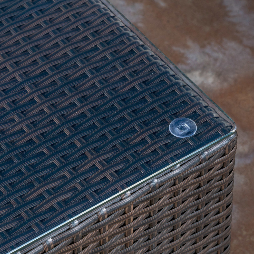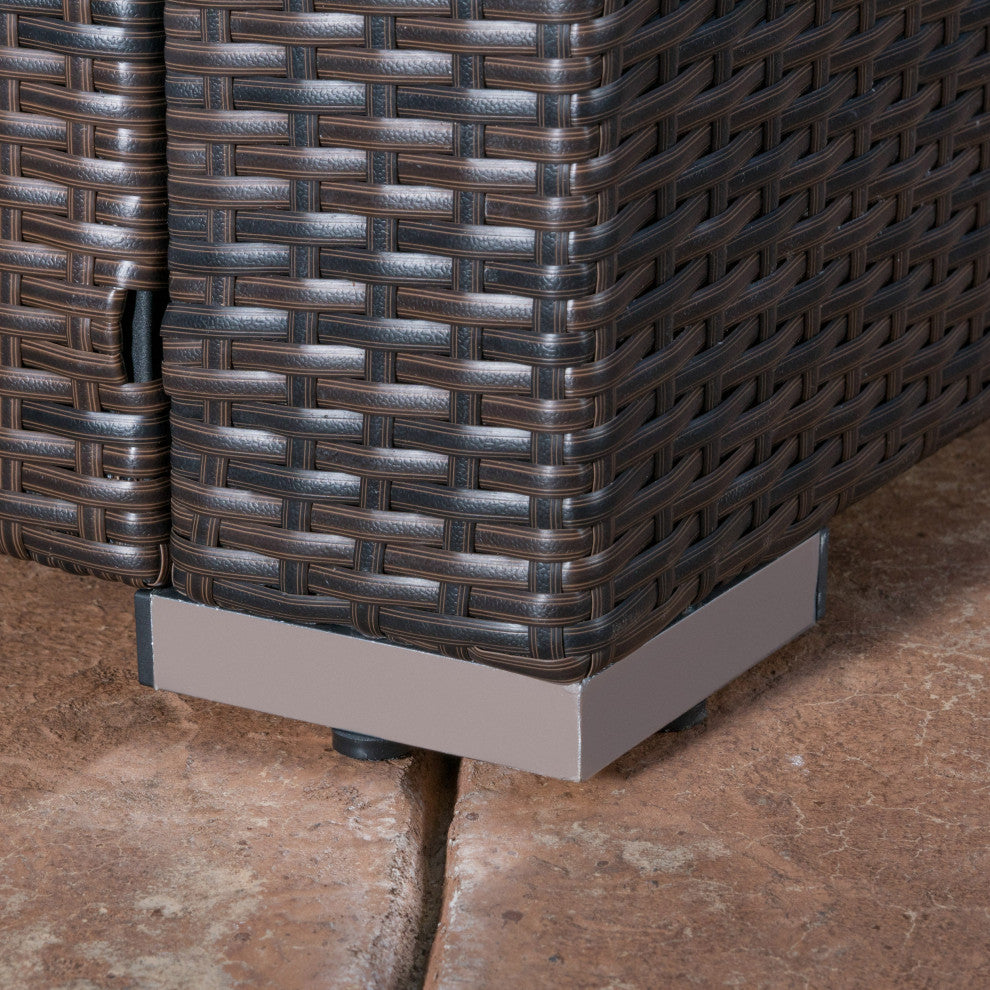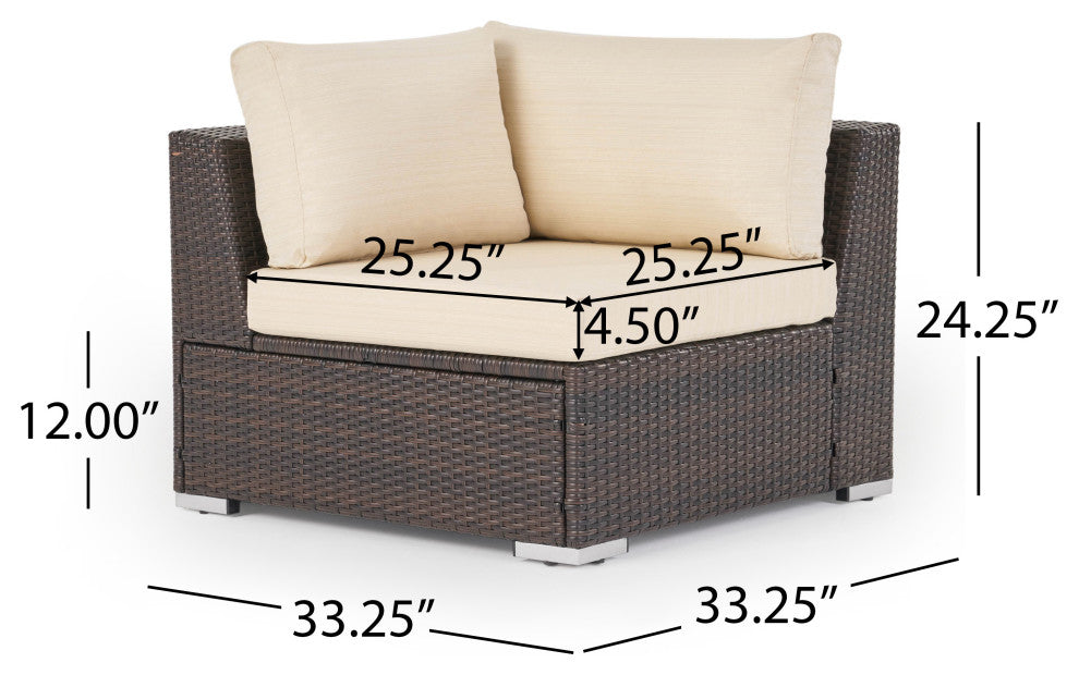 Enjoy a cozy weekend with your family in our six-seater sectional chat set that provides ample space to sit and relax in the great outdoors. This classy set features a stunning wicker weave and includes a matching coffee table with a beautiful tempered glass top. Choose between Sunbrella or water-resistant cushions for long-lasting comfort that is sure to impress. If you choose one of our Sunbrella options, the covers will be shipped separately and should arrive within 72 hours of your set.POLYETHYLENE RATTAN: Featuring a long-lasting woven finish, this style is not only incredibly durable but also provides a versatile appearance. The intricate details of this material allow this piece to blend seamlessly with your decor.ALUMINUM FRAME: This accessory is built with lightweight aluminum, creating a versatile yet durable frame. This material is rust-resistant which will further extend the life of your product.WATER-RESISTANT OR SUNBRELLA CUSHIONS: Our cushions are covered with a non-porous material that makes cleaning any spill a breeze. If you choose one of our Sunbrella options, the covers will be shipped separately and should arrive within 72 hours of your set. Please note that if you do not choose a Sunbrella set, the cushions are water-resistant and not waterproof. Please do not submerge in water.TEMPERED GLASS TOP: The coffee table for this set features a tempered glass top for a smooth, glossy look that offers a stable surface for your drinks and snacks. This glass is made to be stronger and safer than regular glass, making this more resistant to breakage and shattering.MODULAR: This sectional chat set contains separate pieces so you can arrange your furniture to your liking. The club chair is 34" W x 33" D x 24.25" H, the table is 33.25" W x 30.50" D x 13.50" H, and the five-piece sectional sofa offers a convenient modular arrangement. You will love how much your space can transform with the simple addition of this charming set.Includes: One (1) corner chair, two (2) armless chair, one (1) right armchair, one (1) left armchair, one (1) club chair, one (1) tableMaterial: Faux RattanFrame Material: AluminumTabletop Material: Tempered GlassMultiple Cushion Material OptionsMultiple Color OptionsAssembly RequiredOptional Sunbrella Cushion Covers should arrive within 72 Hours of your setAll Dimensions Exclude Cushion MeasurementsLeft and Right Arm Chair Dimensions: 33.25 inches deep x 33.50 inches wide x 24.25 inches highLeft and Right Seat Dimensions: 25.50 inches deep x 28.75 inches wide x 12.00 inches highWeight Capacity: 400 lbsClub Chair Dimensions: 33 inches deep x 34 inches wide x 24.25 inches highClub Chair Seat Dimensions: 25.50 inches deep x 23.00 inches wide x 12.00 inches highArm Height: 24.25 inches highArmless Chair Dimensions: 33.25 inches deep x 25.50 inches wide x 24.25 inches highArmless Seat Dimensions: 25.50 inches deep x 25.50 inches wide x 12.00 inches highCorner Dimensions: 33.25 inches deep x 33.25 inches wide x 24.25 inches highCorner Seat Dimensions: 25.50 inches deep x 25.50 inches wide x 12.00 inches highSeat Cushion Thickness: 4.50 inchesTable Dimensions: 30.50 inches deep x 33.25 inches wide x 13.50 inches highWeight Capacity: 300 lbs