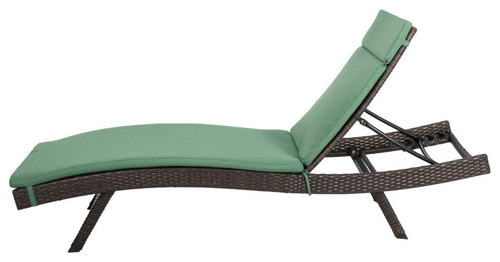Add some stylish comfort to your patio decor with these wicker lounges. Complete with colored cushions to add a touch of fun to your outdoor space, these lounges will have you relaxing in style.Features:Includes: Two (2) Loungers & Two (2) CushionsLounge Materials: PE WickerFrame Material: IronUpholstery Material: Waterproof Fabric (100% Polyester)Lounge Color: Multi brown WickerUpholstery Color: Jungle GreenUV Protection: YesDimensions:Lounger: 82.75"L x 5.00"W x 54.00"HUpholstery: 80.00"L x 26.50"W x 1.50"H