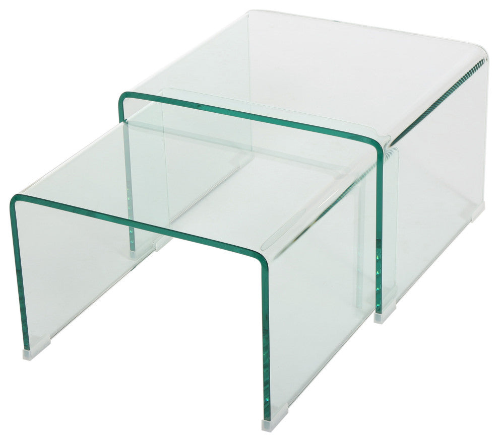 The Angel 12mm Tempered Glass Nesting Tables is a great addition to any home. They are both stylish and clean looking, providing your space with a modern, pure feel. Due to its nesting design, you can mix and match these tables around your living space, or keep them together to show off their matching, connected look.WARNING: Risk of Shatter Associated with Glass FurnitureIn rare instances, tempered glass furniture that is damaged by chips or scratches may break, seemingly of its own accord. Damage to the glass (not always visible) can get worse over time until it reaches a critical point when it may shatter. In the event of damage, this product is designed to shatter into lots of small granular pieces rather than large shards. This is a safety feature to reduce the risk of injury. Features:Includes: One (1) Set of Nesting TablesMaterials: 12mm Tempered GlassLeg Material: PlasticColor: ClearLeg Color: WhiteArrives ready to enjoyDimensions:Large Table: 19.69" D x 17.72" W x 12.99" HSmall Table: 17.72" D x 17.72" W x 11.81" H
