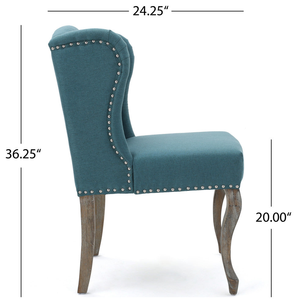 This wingback chair is a great addition for any room. The buttons on the backrest give it a classic design, while the studding on the bottom rim of the chair adds the perfect amount of flair. Made with colors guaranteed to pop, this chair is a must have for your home.Includes: One 2 Chair(s)Material: FabricFabric Composition: 100% PolyesterLeg Material: Rubber WoodAvailable in: Beige, Dark Teal, Light Blue, Light GrayLeg Finish: Dark BrownSome Assembly RequiredDimensions: 27.00" D x 24.25" W x 36.25" HSeat Dimensions: 18.00" D x 24.00" W x 20.00" H