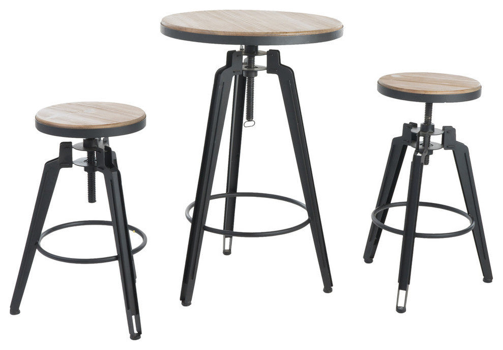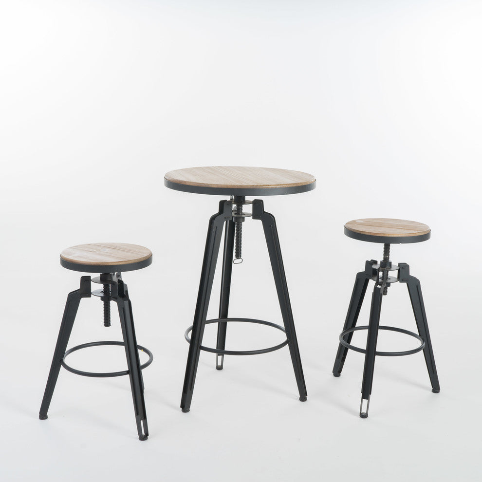 If you are on the hunt for a new bar set to help liven up your living space, than look no further. This bar set not only rotates, but has a great antique finish to the wood, giving the pieces a feeling of history to them. This bar set is ideal for small spaces as well, letting you enjoy the most that your home has to offer.Features:Includes: Two (2) Barstools and One (1) Bar TableMaterial: FirwoodFrame Material: IronFinish: Antique FinishFrame Finish: Black with RustEasy to assemble (tools and instructions included)Dimensions: Barstool: 18.50"D x 17.50"W x 24.50"HBar Table: 24.00"D x 24.00"W x 34.50"H