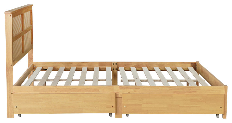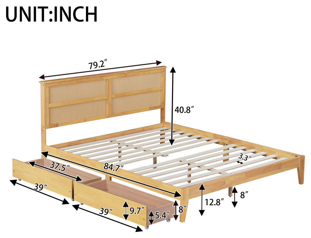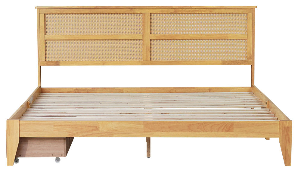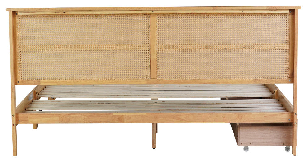 Unique Rattan Headboard: Elevate your bedroom with the distinctive rattan headboard of this king-size bed. Its intricately interwoven design adds vintage charm while creating a cozy and stylish atmosphere. Crafted with superior materials, this headboard not only enhances aesthetics but also promises durability and longevity.