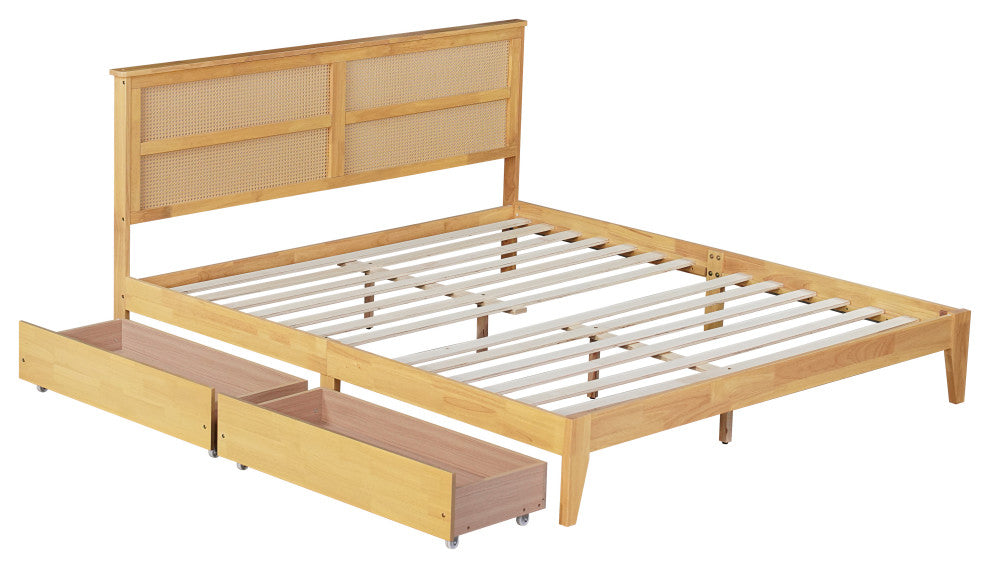 GDF Studio King Size Platform Bed, Rattan Headboard & Storage Drawers, White Oak