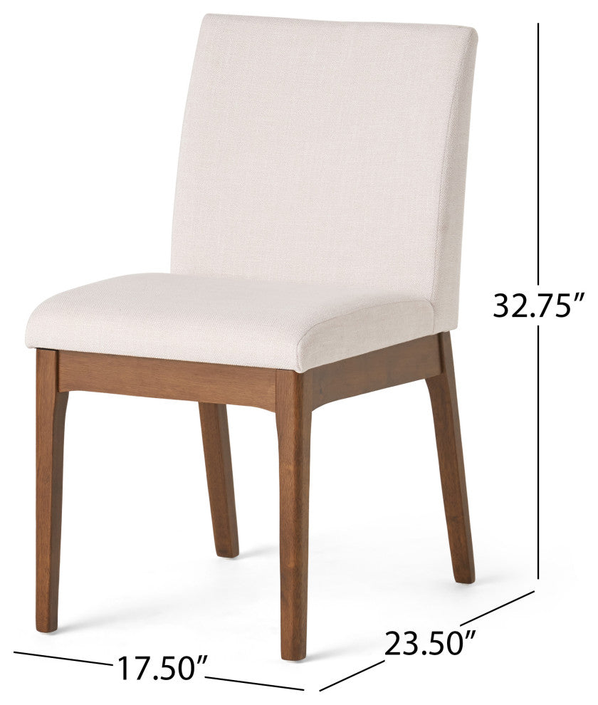 With matching wood finishes, you can''t go wrong with this dining set. Including one table and four chairs, this set is ideal for any home. The mid century style and smooth wood finishes of this set will compliment any decor, so you don''t have to worry about clashing color pallets in your home. The dining chairs feature a sturdy design with soft fabric cushioned seats, providing both comfort and style for your dining pleasure.Features:Includes: One (1) Table and Four (4) ChairsTable Material: Medium Density Fibreboard with an Oak VeneerTable and Chair Leg Material: RubberwoodChair Material: FabricTable Finish: Natural WalnutChair color available in: Mint, Dark Gray, Light BeigeChair Leg Finish: Natural WalnutAssembly RequiredTable Dimensions: 29.53" D x 47.24" W x 29.53" HChair Dimensions: 23.03" D x 17.52" W x 32.09" HSeat Dimensions:17.00" D x 17.50" W x 19.25" H